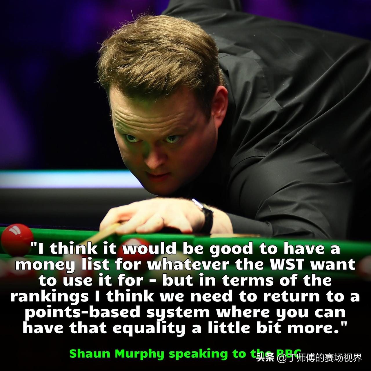 肖恩·墨菲近日在接受BBC采访时表达了对现有排名系统的不满并希望改革:“我认为,无论世界台联想用什么,都应该有一个奖金榜,但就排名而言,我认为我们需要回归 积分制,这样才能更加公平一些。” 墨菲言下之意就是放弃基于奖金的排名制度,重新按照以前的积分进行排名,你同意吗?使用积分的方法是否就会像他所说的公平呢?