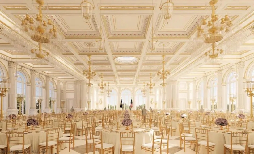 新盖一个9万平方英尺(约 8362平方米)的金色宴会厅将使白宫主楼相形见绌,其面积几乎是白宫现有面积的两倍,它将能容纳999人。