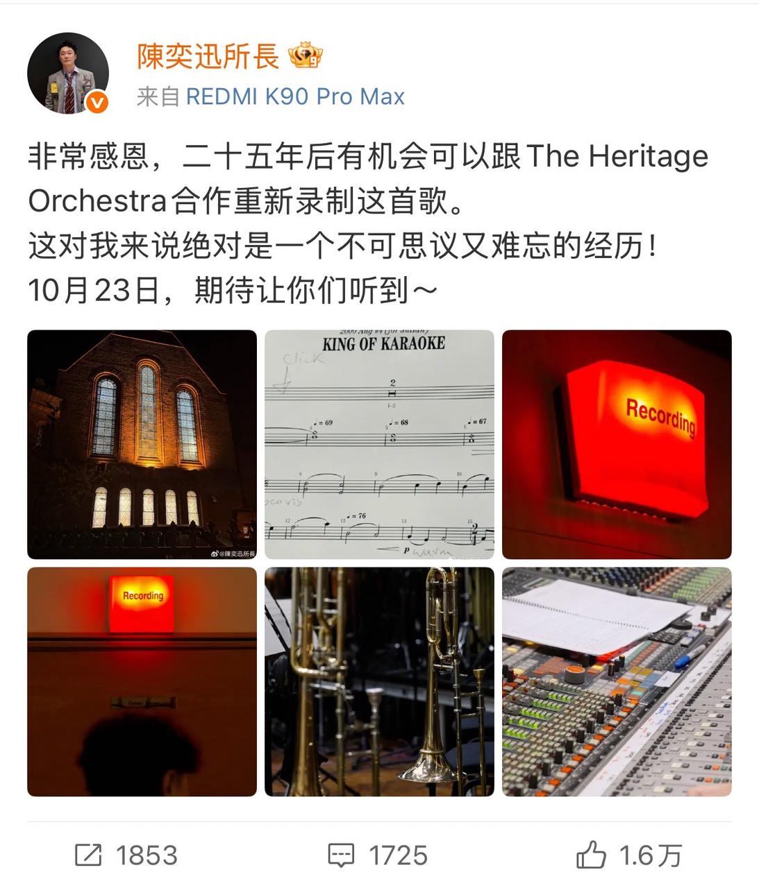 陈奕迅希望再唱30年前天就在微博说重录了《k歌之王》,今天终于听到了,第一次听这首歌的时候还小,如今听重录版的又是另一种感受了!