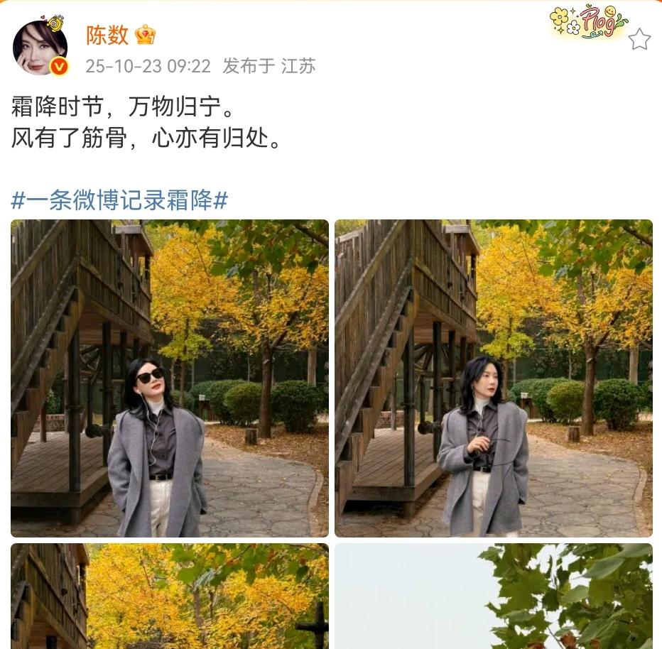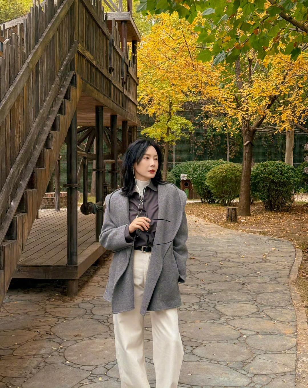 陈数晒秋季穿搭,配文:霜降时节,万物归宁。风有了筋骨,心亦有归处。 不得不说,穿搭精彩,配文也精彩。 是哦,霜降了,风有点刺骨了,要加衣服了。这个时候,像陈数这样穿,温暖又好看。 灰色外套搭配白色裤子,高级又清爽,不失时尚感,瞬间把秋天的沉闷感驱赶走,棒棒的! 墨镜的搭配,给整个穿搭添了几分酷酷的味道,魅力更十足。总之,陈数的这身秋季穿搭很好看! 各位,你们觉得好看吗?