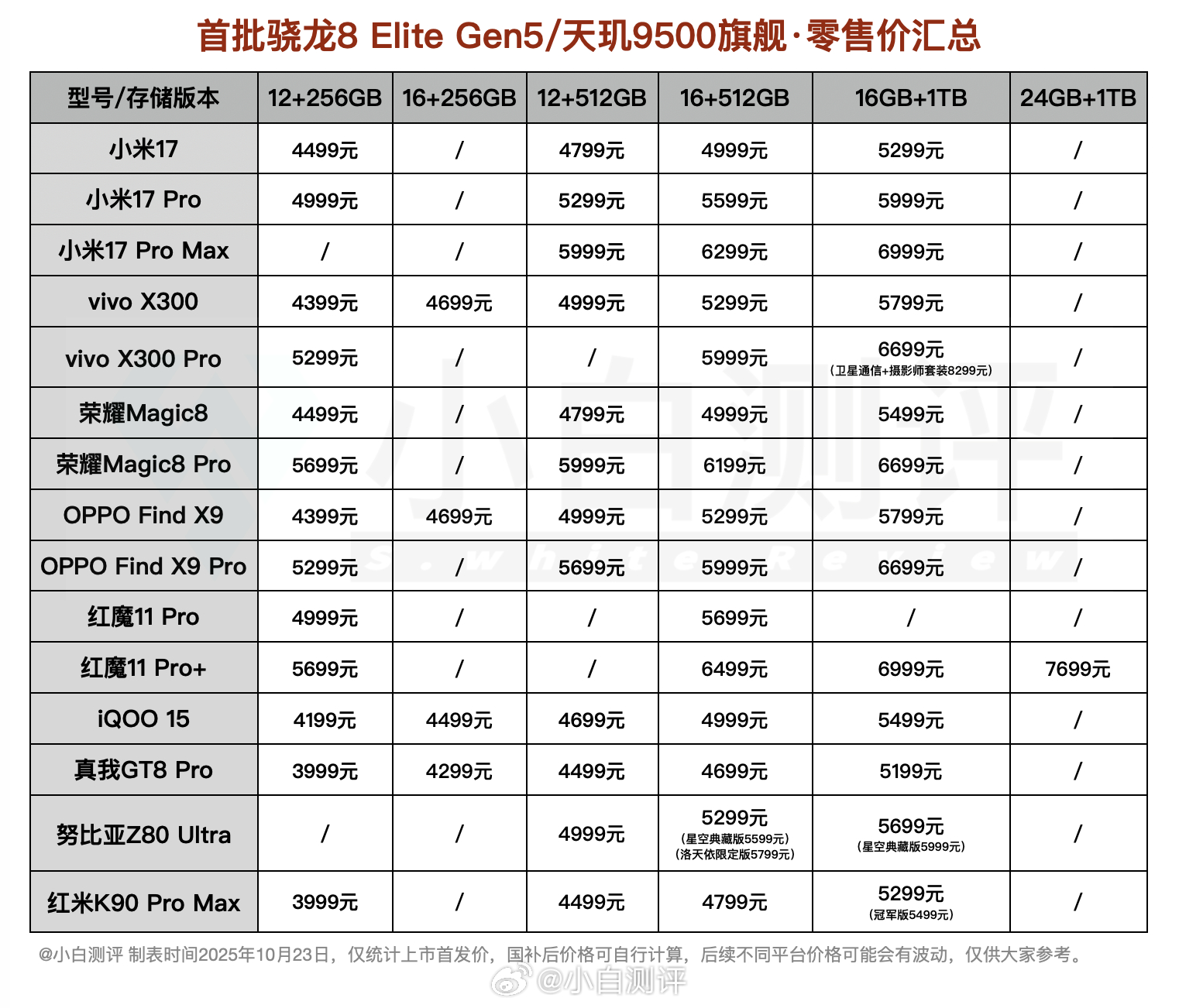 更新下首批骁龙8 Elite Gen5和天玑9500旗舰价格表