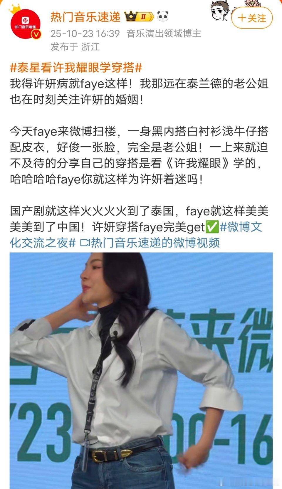 泰国女星faye也在追剧,去大眼扫楼还特地分享自己的穿搭是看《许我耀眼》学的[笑cry]