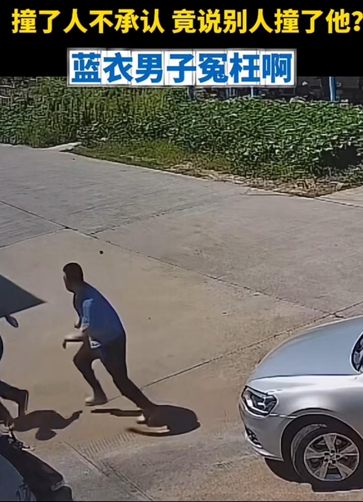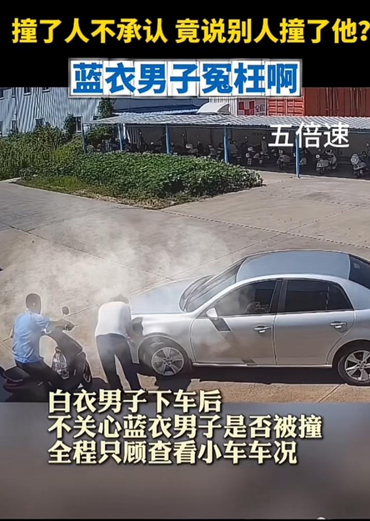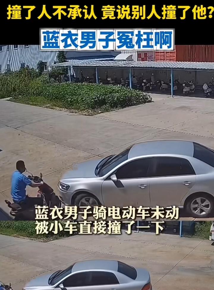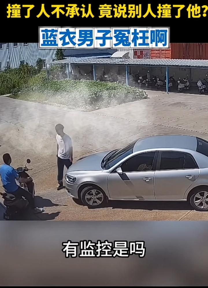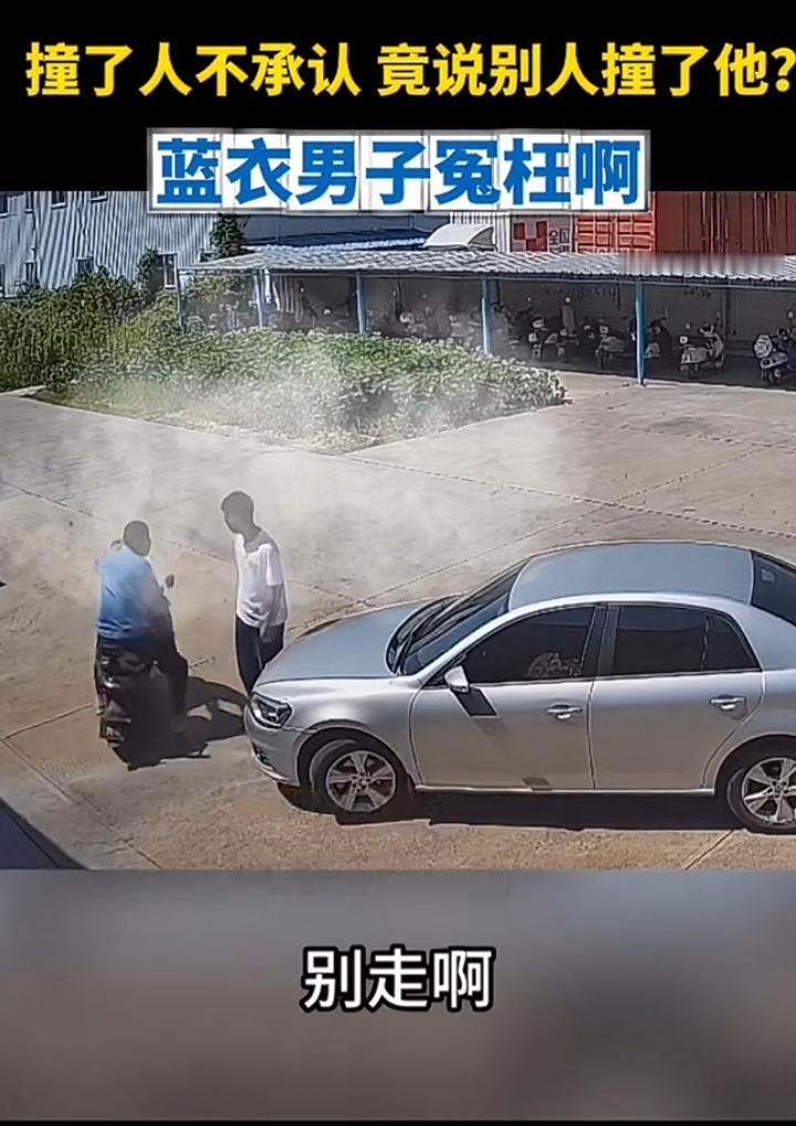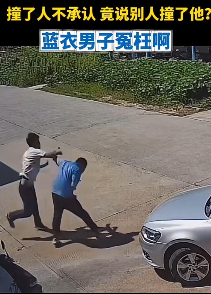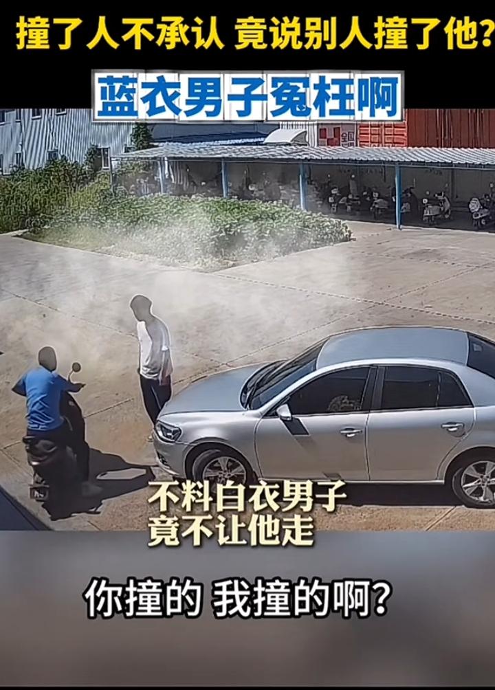蓝衣男子停车驻步岂料一辆小车缓缓朝自己驶来咔叱一声撞到了,白衣男子立即停车查看,