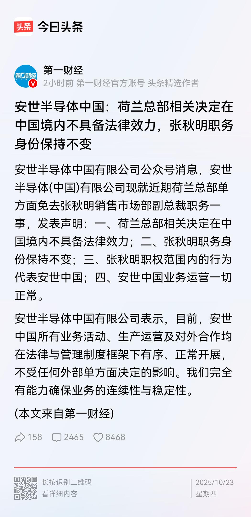 荷兰这一次真是踢上铁板了,安世中国就在刚刚做出最新反击,霸气宣布荷兰总部决定在中国无效!原来,安世半导体荷兰总部不久之前,竟然下了一个命令,要免去张秋明销售市场部副总裁的职务,张秋明是安世半导体中国有限公司的高级管理人员,荷兰总部下达这个命令,显然就是想要彰显自己对于安世中国的控制权,可这注定是痴心妄想。 针对这个命令,安世半导体中国有限公司立刻做出反击,直接宣布荷兰总部这个决定不具备任何法律效力,张秋明的职务身份都将保持不变,这个反击充分体现出了现在安世中国拥有完全独立自主的运营管理权限,丝毫不会受到荷兰总部的要挟钳制,安世半导体荷兰总部这一次是踢上铁板了,它本想彰显自己的权力,但是现在已经成为了一个彻底的笑话。 安世中国这一次反击也给所有对中国企业有不轨企图的势力做了一个警告,不要妄想着中国企业会忍气吞声逆来顺受,我们虽然和气待人,但也绝不是好欺负的,如果谁敢破坏公平公正的贸易规则,走上了巧取豪夺的歪门邪路,那么接下来迎接它的将是它根本无法承受的凌厉反击,到时候后悔的只能是它自己!