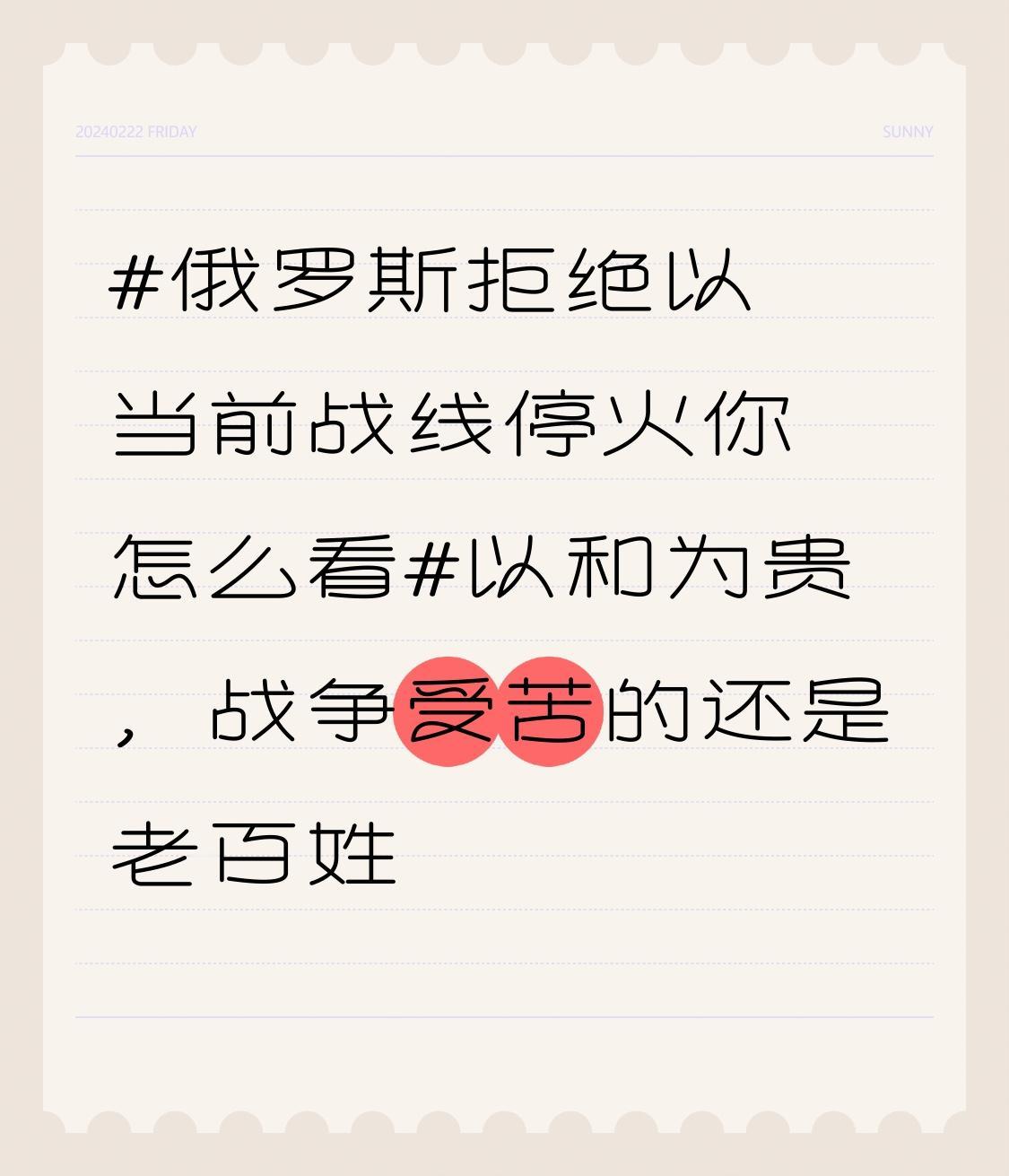 俄罗斯拒绝以当前战线停火,这事儿吧,背后门道不少。以和为贵是没错,战争里最苦的就是老百姓,这点谁都清楚。可俄罗斯也有自己的考量。 从军事角度看,俄军正打得顺手,他们信奉战场上打不来的,谈判桌上也别想得到。现在停火,之前的努力可能白费。而且俄罗斯把乌克兰战场当作打破雅尔塔体系残余的机会,北约五轮东扩的战略挤压,让他们不想轻易放弃。 从外交层面讲,美国等西方国家的态度也很关键。美国军援乌克兰,也只是不想让俄罗斯“野心太大”,但俄罗斯也不想被西方牵着鼻子走。总之,和平是大家都期望的,但俄罗斯拒绝停火也是基于自身利益的慎重选择。