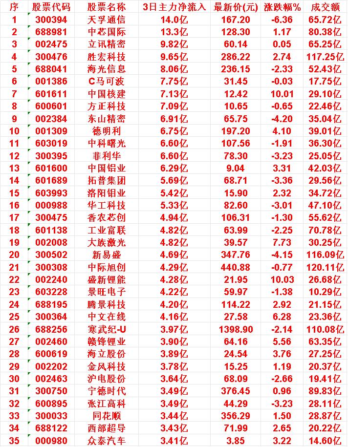 10月24日,前3天主力大幅买入的35名单! 天孚通信:3日主力净流入 14.0亿元,最新价 167.20元 中芯国际:3日主力净流入 13.3亿元,最新价 128.30元 立讯精密:3日主力净流入 9.82亿元,最新价 60.14元 胜宏科技:3日主力净流入 9.65亿元,最新价 286.22元 海光信息:3日主力净流入 8.06亿元,最新价 236.15元 C马可波:3日主力净流入 7.75亿元,最新价 31.45元 中国核建:3日主力净流入 7.13亿元,最新价 12.42元