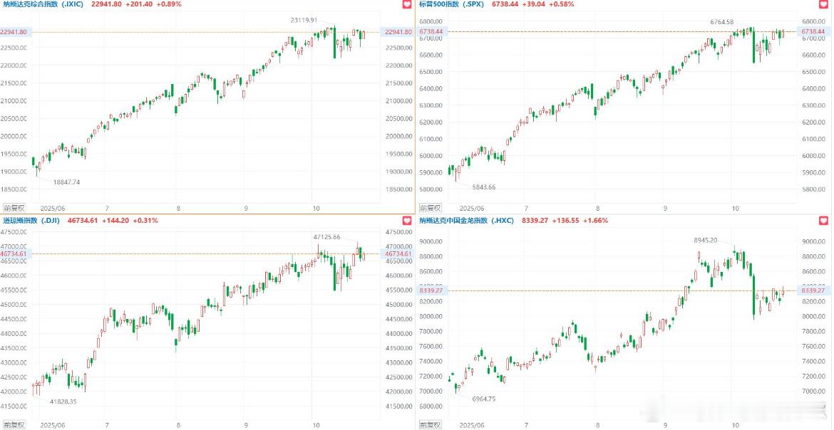 10月24日|美股三大指数集体收涨,纳指涨0.89%,标普500指数涨0.58%,道指涨0.31%。大型科技股多数上涨,英特尔涨超3%,特斯拉涨超2%,亚马逊、英伟达涨超1%,苹果、谷歌、Meta、微软小幅上涨;奈飞小幅下跌。
