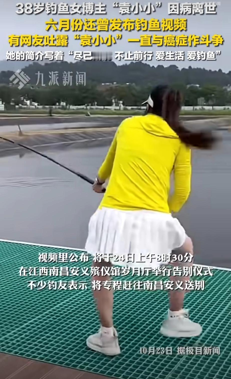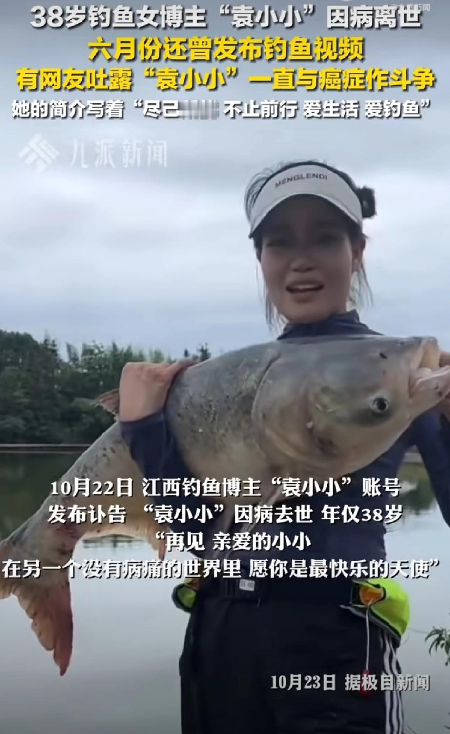 38岁的钓鱼博主袁小小,在10月22日悄悄告别了这个世界。 直到她的账号更新了一条置顶视频,配文简单却沉重:“再见,亲爱的小小。在另一个没有病痛的世界里,愿你是最快乐的天使。” 很多人才突然意识到,这个总在阳光下甩竿的姑娘,原来一直默默扛着病痛。 其实她生病很久了,只是从来不说。网上传是肠癌,但家人没公开证实。她照常更新钓鱼视频,九月还在河边抛竿,写些“治愈你的是内心的度与量”这样的话。 现在回头看,那大概是她留给世界的温柔掩饰。就连化疗掉头发,她都戴着假发继续出镜,直到最后还在传递那股子劲儿。 更让人破防的是圈内人的反应。邓刚人在国外,却连夜剪了8分钟视频悼念,还承诺要负担她孩子部分学费,捐出下一场商业收入。 “夏氏机电”直接开车700公里赶到南昌送她。这些举动背后,是一个普通钓鱼博主用真诚换来的尊重。 说实话,袁小小粉丝才2.6万,不算大红大紫。但去年她和邓刚组队打比赛的那场视频,至今还被粉丝反复看。 她输得坦荡,笑得也敞亮。现在翻她评论区,三千多条留言里很少有人聊钓技,多的是说“从她那儿学会了怎么和生活握手言和”。 这几年年轻博主早逝的新闻不少,每次都在提醒我们:别被“体面”绑架了健康。袁小小们总想着把最好的一面留给大家,却忘了病痛最需要被看见。 她的离开,与其说是警示,不如说是一份温柔的提醒——热爱固然可贵,但那份热气腾腾的生活,终究需要健康的身体来托底。