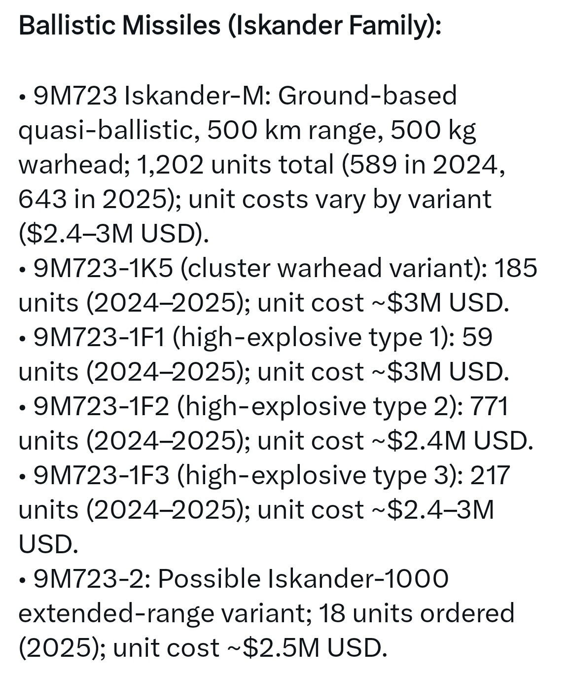 🔻9M723 伊斯坎德尔家族(240-300万美刀1发,2024-2025采购1202发,其中2025新采购增程1000km版本伊斯坎德尔18发)