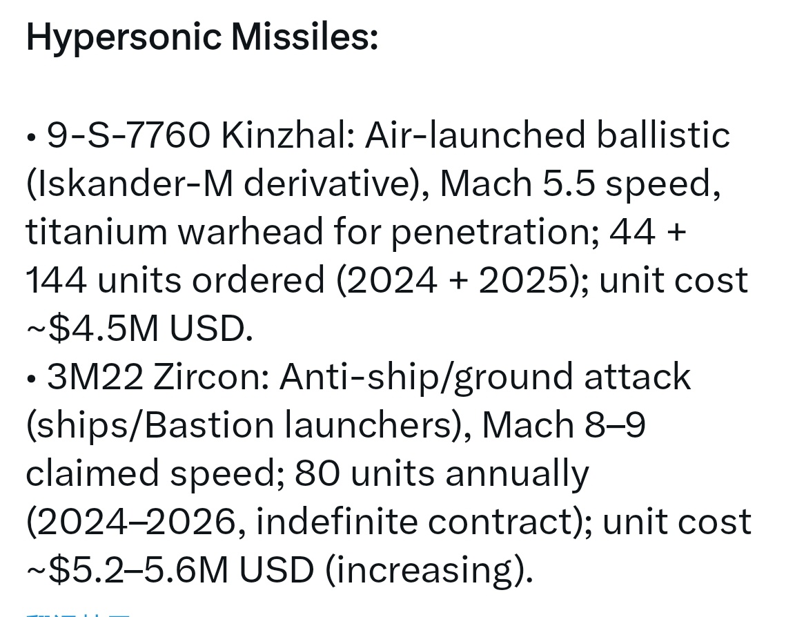 🔻乌U军事报刊登的此前获得的俄军采购合同关于巡航导弹,弹道导弹,高超导弹的采购数量和价格。