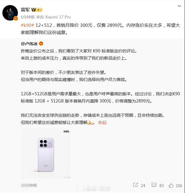 雷军回应K90定价雷军转发卢伟冰博文回应K90定价:内存涨价实在太多,希望大家能理解我们这份诚意。你们会理解吗[思考]