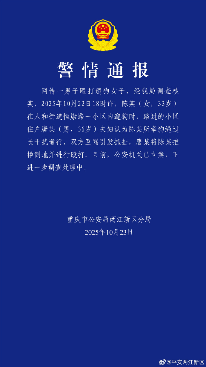 10月23日,发布通报:网传一男子殴打遛狗女子,经我局调查核实,2025年10月22日18时许,陈某(女,33岁)在人和街道恒康路一小区内遛狗时,路过的小区住户唐某(男,36岁)夫妇认为陈某所牵狗绳过长干扰通行,双方互骂引发抓扯,唐某将陈某推搡倒地并进行殴打。目前,公安机关已立案,正进一步调查处理中。