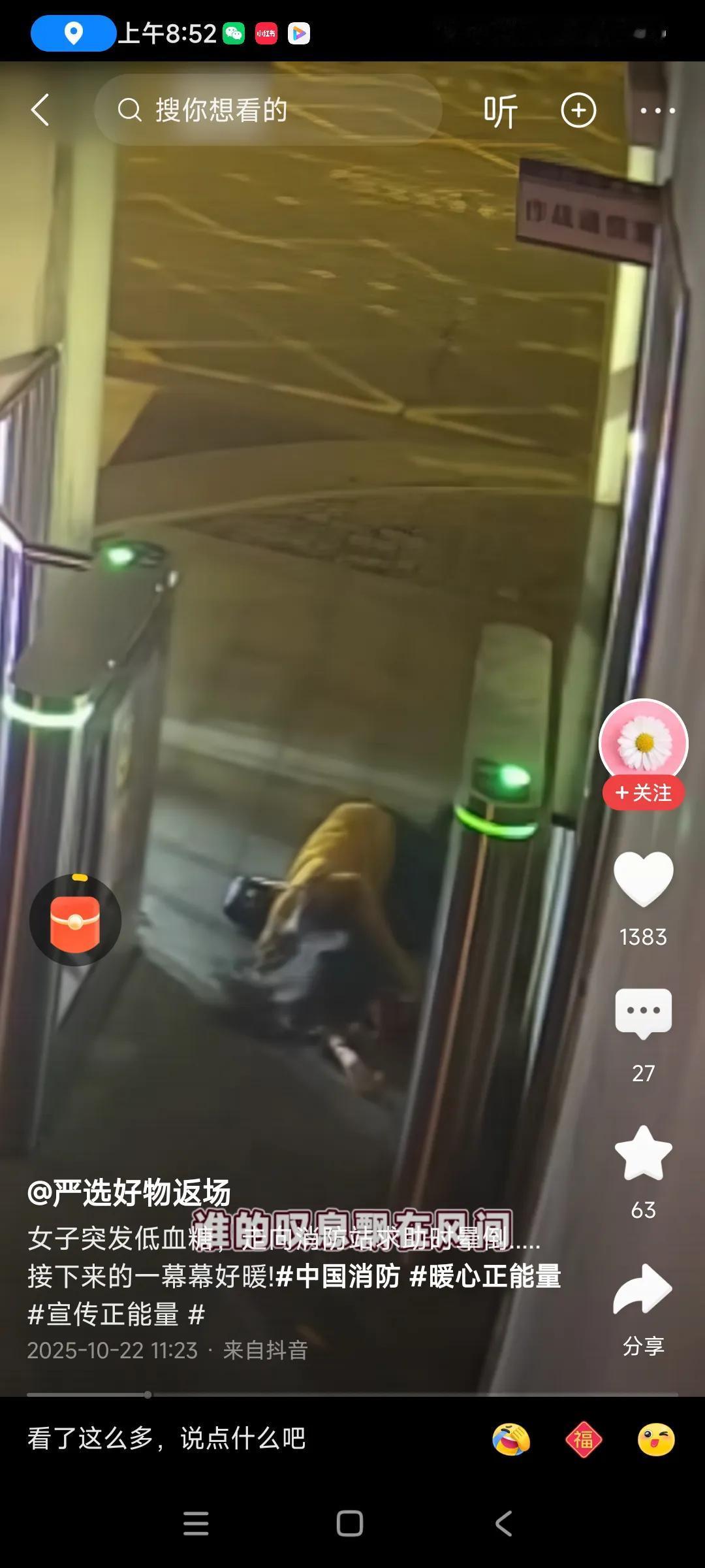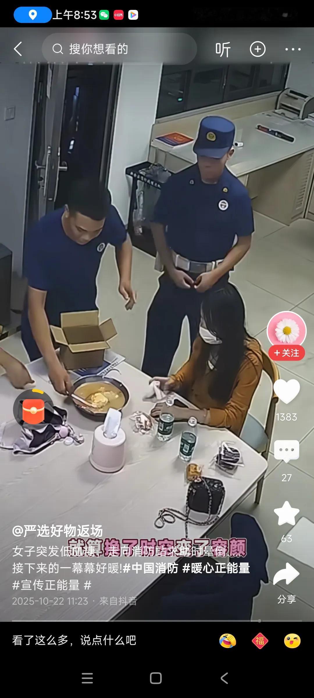 消防队战士太可爱了,女子深夜低血糖晕倒在地上,刚好在消防队门口,战士们马上出动,扶起来后,煮了鸡蛋面,吃下后,好了很多,救了她一命,,,万分感谢,,, 我上次也是有惊无险,记得是上午九点,我当天休息,兼职送外卖,有个消防队战士点了两杯咖啡,价值40多元,我不小心掉地上,有一杯漏了一半,另外一杯没事,这下肯定要赔钱了,到了消防队门口,打电话,那个战士出来了,我说赔他25元,他怎么说不要,非常客气,说没事,算了,,, 这要是换个其他人,差评,赔钱,少不了的,[捂脸][捂脸]
