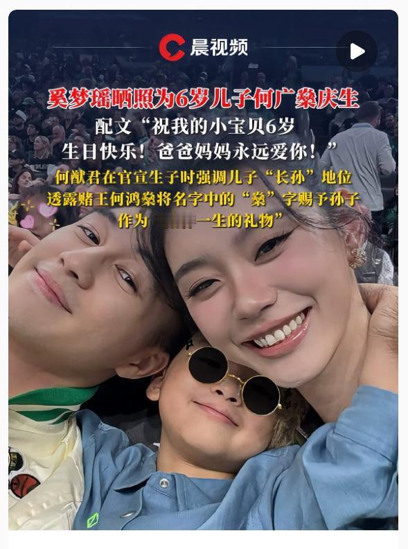 豪门长孙的成长太有看头了, 不信你看何广燊, 小王子的生日甜到人心坎里。 今天刷到奚梦瑶发的庆生照,一家三口凑在一起笑,她写着祝小宝贝6岁生日快乐爸爸妈妈永远爱你,字里行间都是当妈的温柔。何广燊可是赌王长孙,当年出生时何猷君特意强调过这身份,连名字里的"燊"都是赌王给的,祖孙俩虽然没见过面,但这份传承藏都藏不住。 再看照片里的小广燊,个子都到爸妈腰了,单眼皮高鼻梁,跟爸爸何猷君一个模子刻的,小小年纪就有股子机灵劲儿。两口子搂着孩子,没什么花哨布置,就这么简单的合照,反而更显家庭的温暖。 这样被全家人捧在手心里长大的孩子,怎么能不招人疼呢?