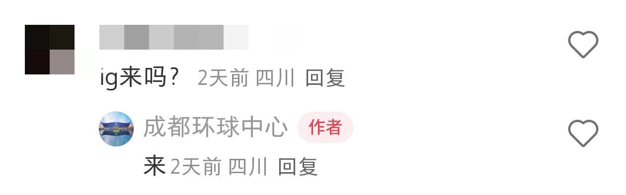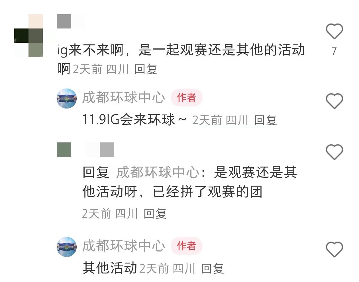 xhs发文:iG会来成都环球中心参加活动 想去的粉丝们可以蹲一蹲
