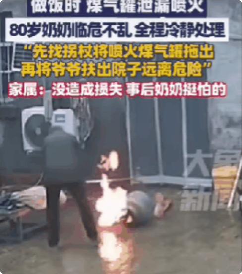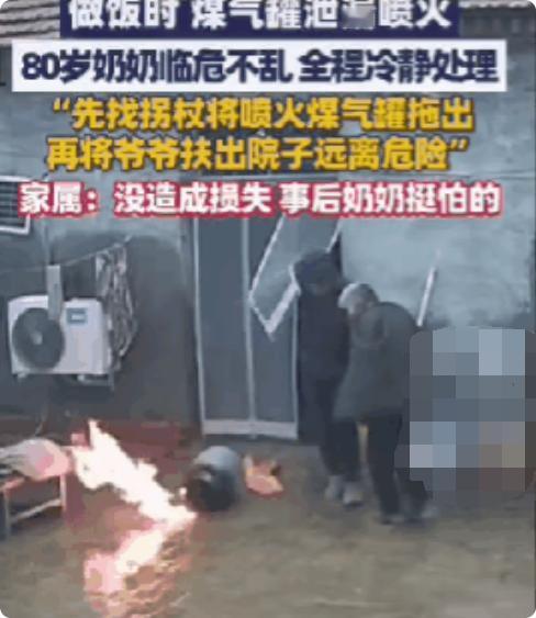 那一刻,她是‘老小孩’,更是爷爷的守护神 刚才刷到一个视频看到我热泪盈眶,心里一阵温暖又有些心酸。 事情是河南濮阳,一位八十多岁的老奶奶正在做饭,家里的煤气泄漏突然喷出大火。那一瞬间,要是换成我的话,早就吓得鸡飞狗跳,尖叫着跑走了。 但老奶奶并没有。他转身拿起拐杖,冒着熊熊大火,硬是把那个危险的煤气罐一步步拖出了厨房。当危险解除后她没来得及休息,立刻走进屋里,领出来了一位年迈的爷爷。 整个过程,他不慌不忙,冷静的让人心疼。 看完视频我有点泪目了,在平时他也是需要别人搀扶照顾的老小孩啊,可是在关键时刻,对老伴的爱,让她瞬间扛起了家的责任,成为爷爷的守护神。 这大概就是执子之手,与子偕老”最真实的写照吧!就算我们都已经白发苍苍走不稳路了,当灾难来了,我依然对你无微不至。 你们身边有这样勇敢的老奶奶吗,哈哈