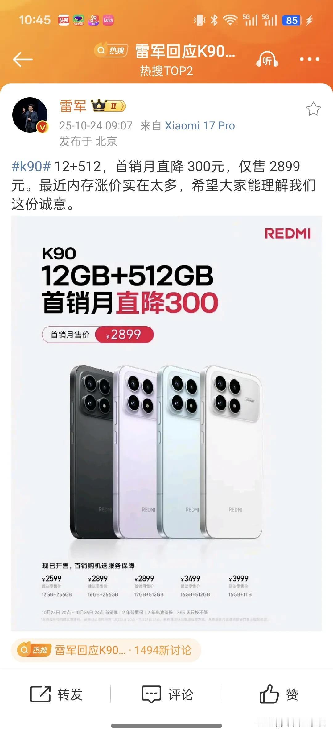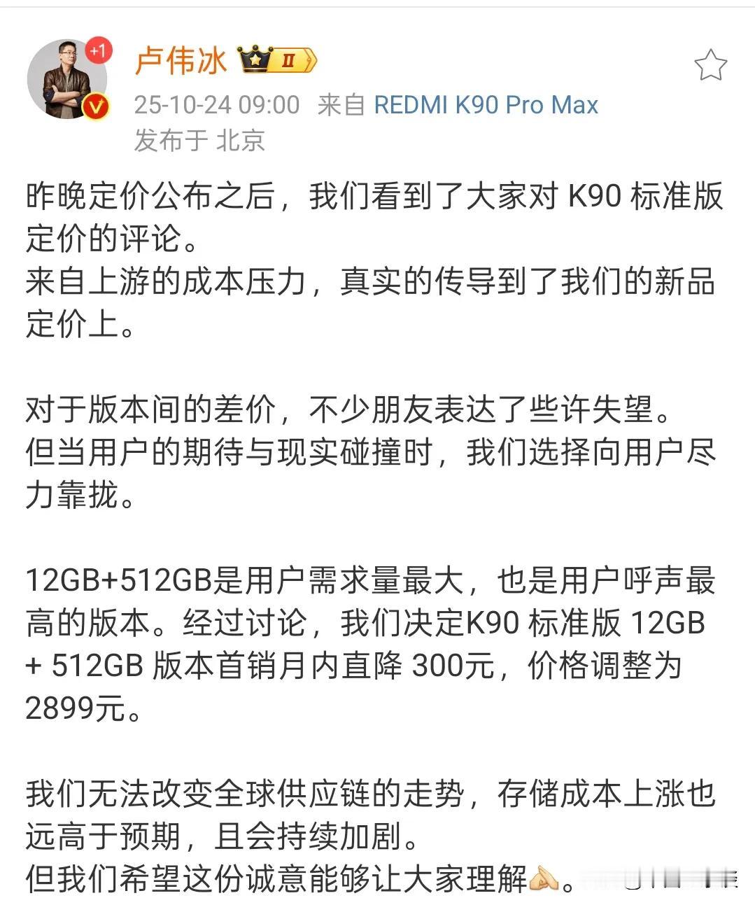 卢伟冰表示REDMI K90标准版12+512G首销月内降300,价格调整为2899。 ​​​在存储价格飞涨的今天,2899确实很有诚意了! ​​​