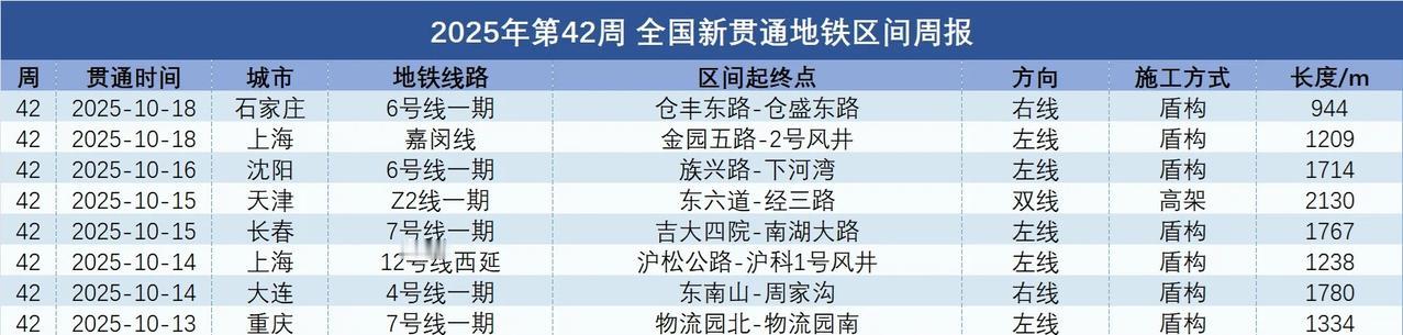 2025年第42周 全国新贯通地铁区间周报 本周,随着节后建设进度逐步恢复,全国新增贯通9个区间,总里程13.32km。今年以来,全国累计贯通区间里程已达650.19km。 本周重要节点包括: 1️⃣上海地铁2号线西延通过初期运营前安全评估 2️⃣长沙地铁2号线西延二期首通段热滑 3️⃣深圳地铁13号线二期北延环网电通 4️⃣天津地铁Z2线一期首通段开始铺轨 5️⃣长春地铁7号线一期全线贯通 6️⃣杭州地铁10号线三期首个区间贯通 7️⃣杭州地铁12号线一期首座车站封顶 轨道交通