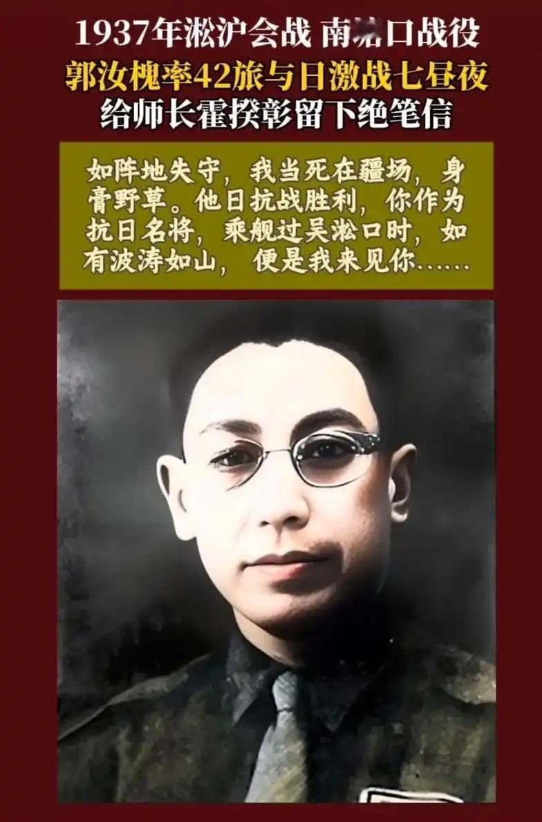“我八千健儿已经牺牲殆尽,敌攻势未衰,前途难卜。若阵地存在,我当生还晋见钧座。如阵地失守,我就死在疆场,身膏野革。他日抗战胜利,你作为抗日名将,乘舰过吴淞口时,如有波涛如山,那就是我来见你了。”——郭汝瑰