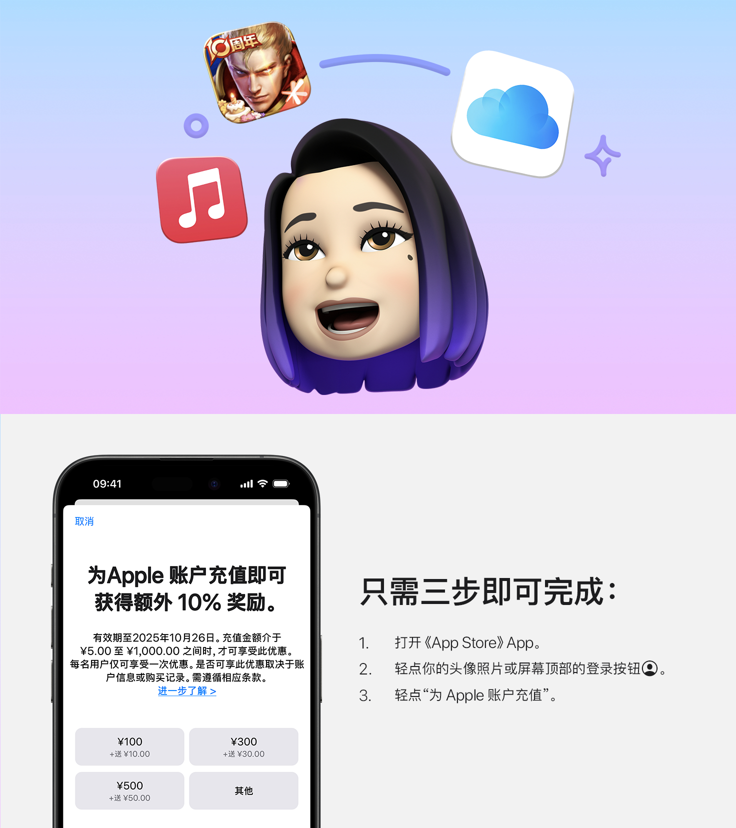 Apple 限时福利来了!即日起至10月26日,为 Apple 账户充值,就能额外获得 10% 奖励金额