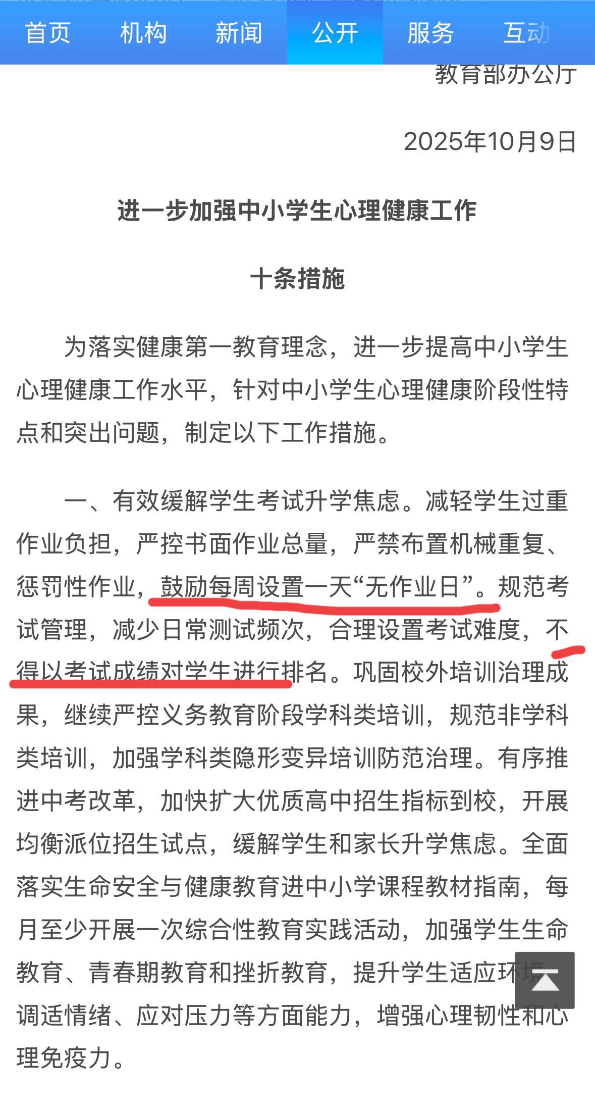 老师以后教学压力将会越来越小了! 前几天教育部办公厅关于印发《进一步加强中小学生心理健康工作十条措施》的通知,文中建议每周留一天时间不给学生布置作业,称为"无作业日"。意味着老师那天也可以不用改作业了。 另外文中也强调不得以考试成绩对学生排名,家长与学生对成绩的期待也将下降。这些措施一出,将进一步减轻学生学业负担。也给广大老师减轻教学压力,那样也将有更多时间育人。教师职责是教书与育人,教书花的精力少了,育人的精力就更多了。做好两者的平衡对于提高学生心理健康水平也是有促进作用的。中小学教学压力 教师压力 青年教师压力 教学工作压力 教师压力疏导 学生压力 青少年压力疏导