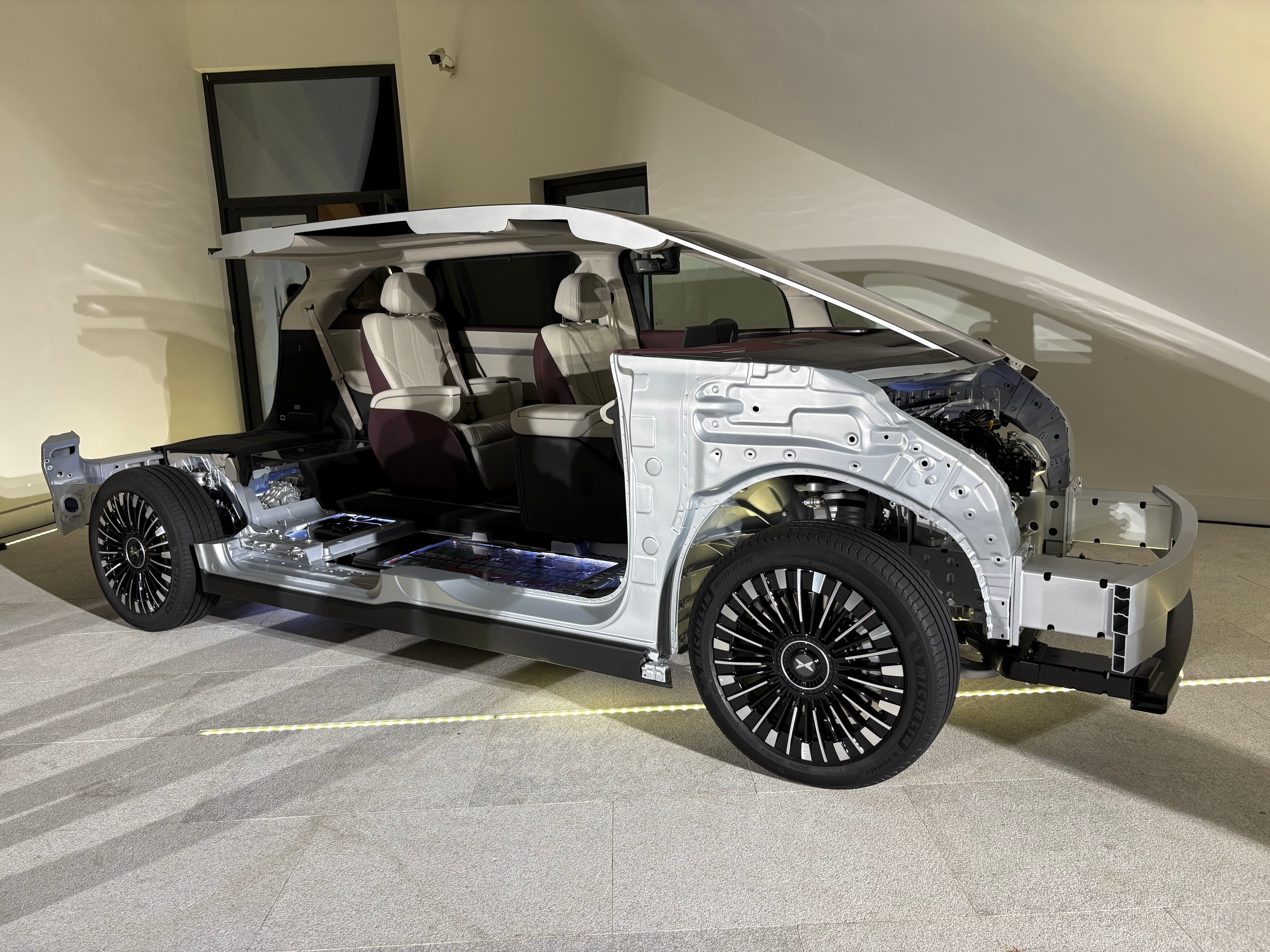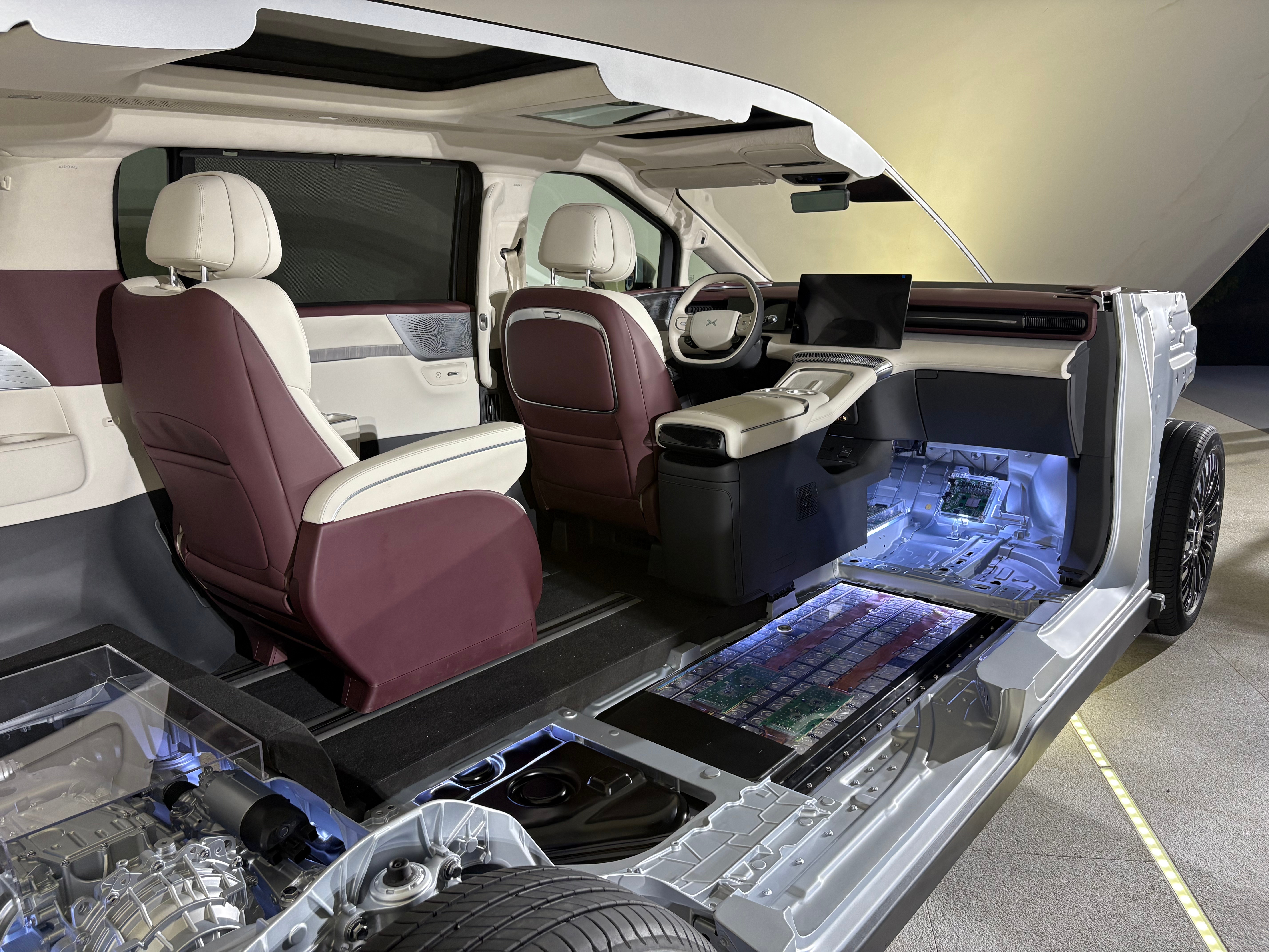 来试驾小鹏X9增程版,第一步先看拆车件~说实话咱也是看了不少拆解车了,但小鹏X9增程版这个太夸张了,跟个艺术品似的。发动机、增程器、图灵芯片、前排底部的电池、后排下边的油箱,规规整整的。最重要的是,后轮转向还在,双腔空悬还在,甚至三排座椅的折叠空间也还在,就离谱!小鹏X9超级增程保留后轮转向