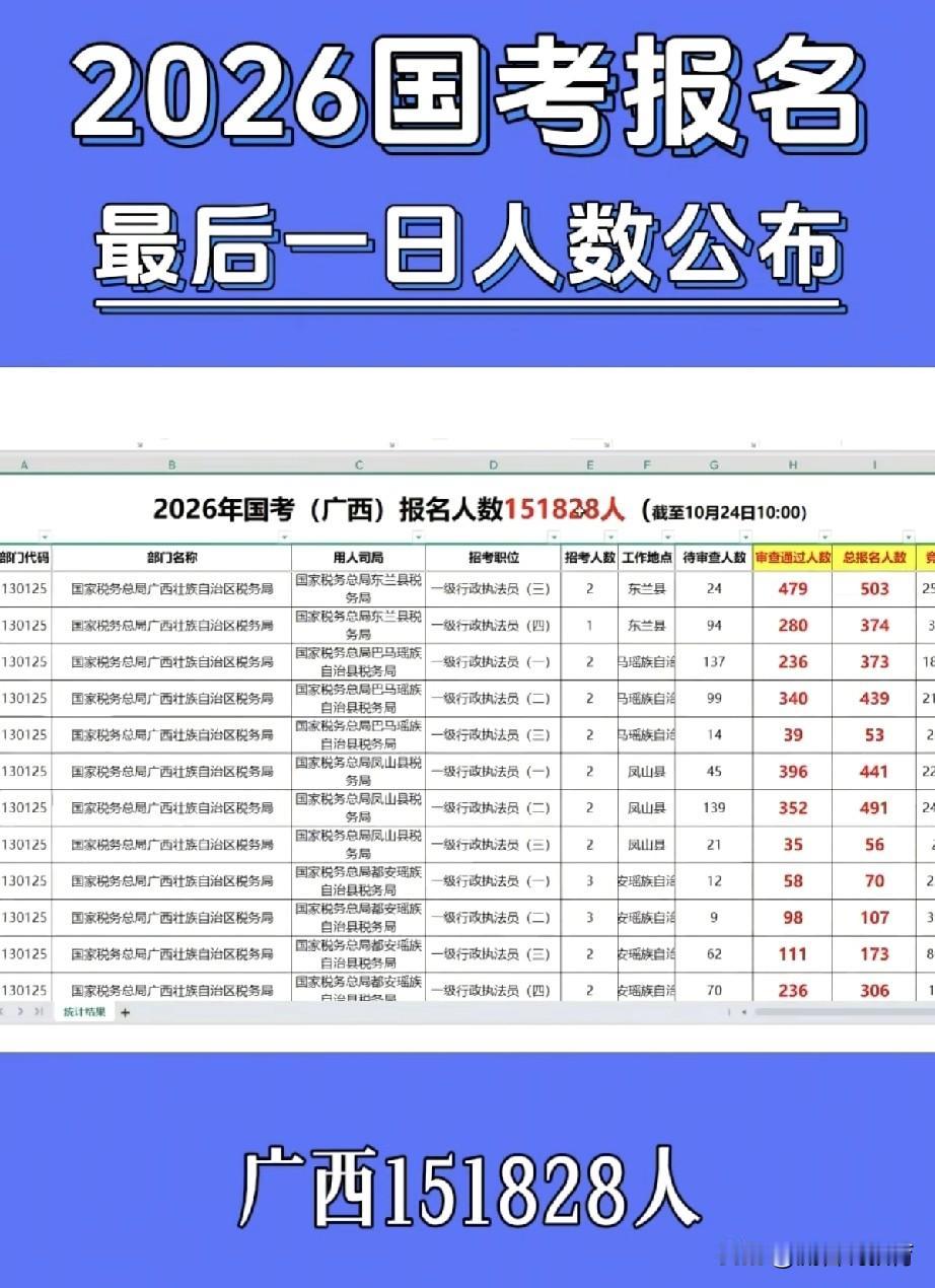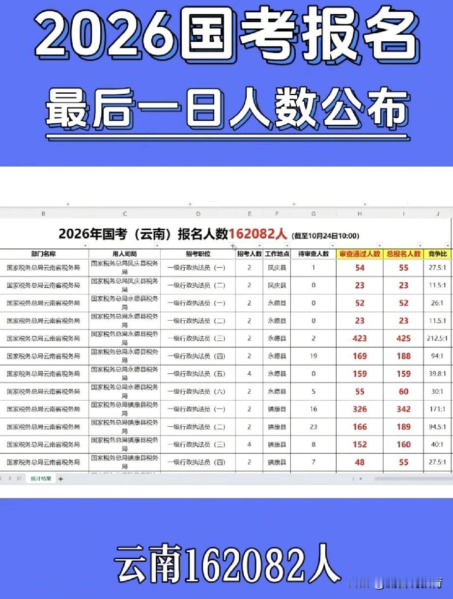 2026国考报名最后一日人数公布! 截至2025年10月24日10点,2026年国考全国累计报名人数已突破331万,最终报名人数可能在380万左右。以下是部分地区和岗位的报名情况: 地区报名人数: 贵州:83634人 广西:151,828人 云南:单岗位报名人数超过7,000人,总报名人数162082人 黑龙江:74,137人 青海:28,988人(报考294个招录岗位) 岗位竞争情况: 全国最大竞争比:7,107:1 贵州最大竞争比:3,012:1 无人报考岗位: 部分岗位仍无人报考,但具体数量尚未公布 官方最终报名数据可能在截止时间(10月24日18:00)后公布,建议考生关注国家公务员局官网获取最新信息!