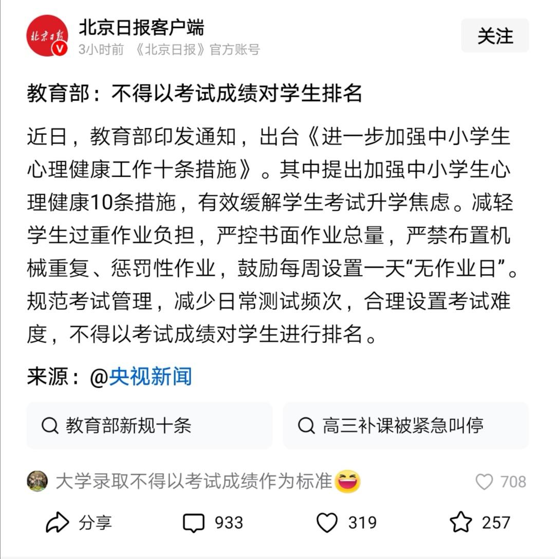 不得以考试成绩对学生排名,不知重申了多少年多少次了。但是,有多少学校落实禁令?学生的学业负担有减轻吗?中高考用考试成绩、排名录取学生是一方面原因,更重要的原因是,地方政府部门与社会,是用升学率评价学校与教师,只要不用升学率、学生成绩评价学校、老师,学校就可以做到不对学生进行排名。当前学校的违规办学,大都出于追求升学率。
