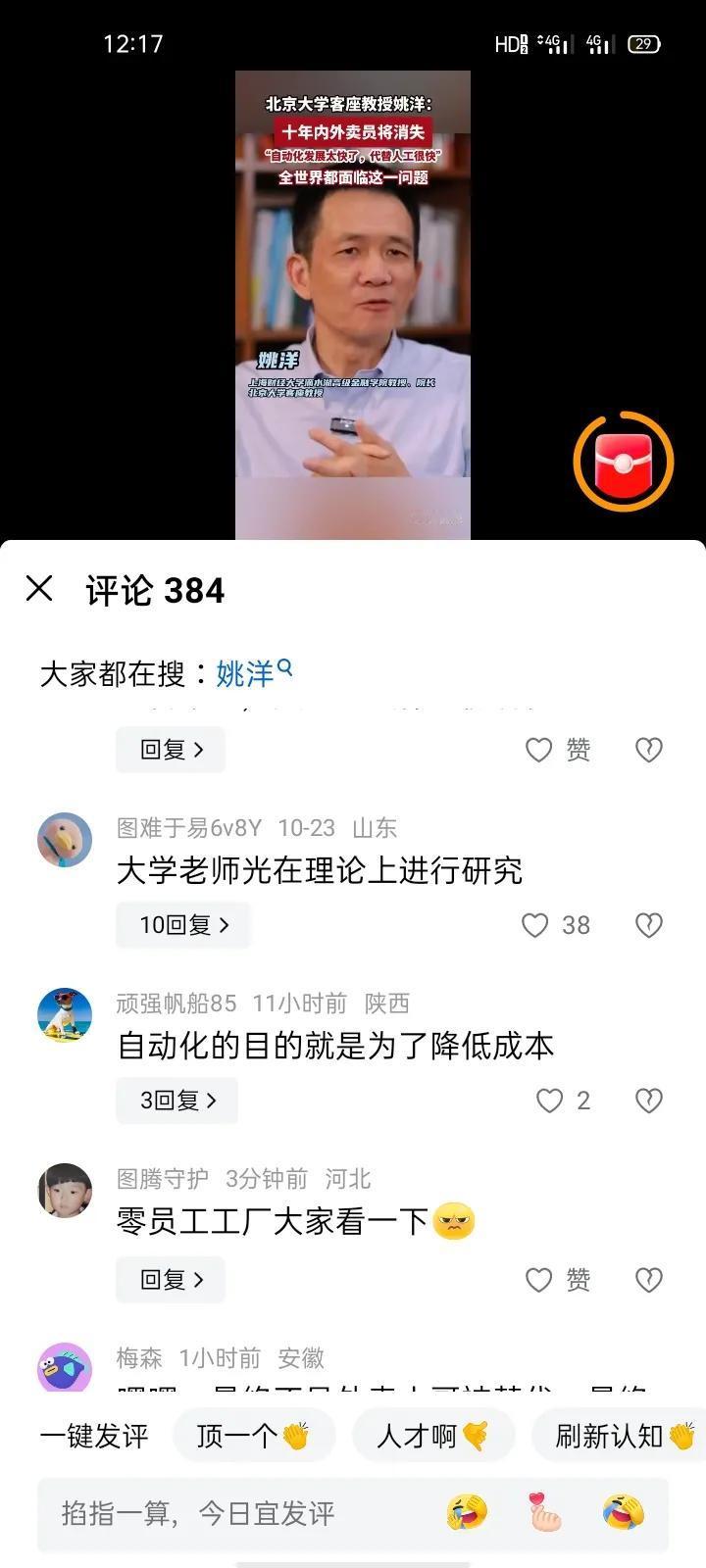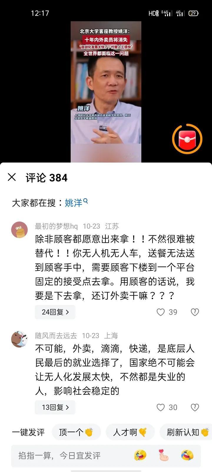 外卖小哥十年内会被替代!北大客座教授又出来发话了! 如果外卖都被取代,人不能够赚钱,还用点外卖吗? 工厂无人打工,谁还点外卖! 都在家躺着无所事事,有没有发钱的不知道。当然,啃老的话,如果爸 。比没有养老金怎么办? 大学老师还是研究点别的吧!太吓人了