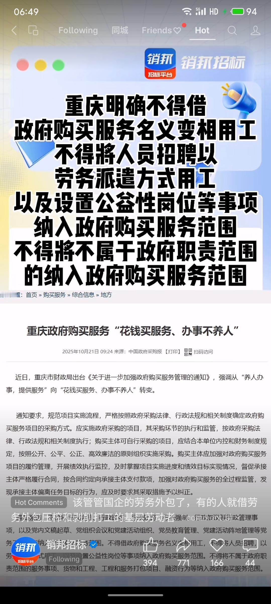 重庆市财政局近日发文规范政府购买服务,明确禁止借购买服务名义变相用工,不得将招聘、劳务派遣、公益性岗位等纳入范围,旨在推动从“养人办事”向“花钱买服务”转变。
