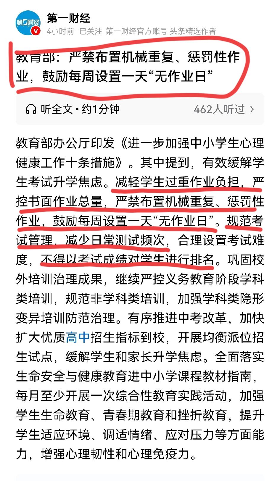 近日,教育部印发《进一步加强中小学生心理健康工作十条措施》 减轻学生过重作业负担,严控书面作业总量,严禁布置机械重复、惩罚性作业,鼓励每周设置一天“无作业日”。 我为教育部的规定击掌喝彩,并且希望下面的小学能够严格执行。 因为我孩子现在小学,每天语文作业,数学作业多的做不完,除了课本上的作业以外,语文和数学作业还有每天一张试卷,语文要求家长陪孩子背诗,要理解古诗大意,第二天去说不出古诗大意,又在群里批评家长,晚上又带回来惩罚性作业。上个小学把孩子搞崩溃了,也把我们家长搞崩溃了。 我记得以前读书的时候,小学8:00是上早读,10:30不到就放学了,下午1:00读书,3:30左右就放学了。我们每天都非常快乐,作业有,但是不多。后来上初中、高中有作业,但都是在学校完成了,我最后也考了个大学一本,我也找了个还算行的工作,月薪五六千,在云南小县城也算可以了。 搞不清楚,现在小学卷成这样干嘛!