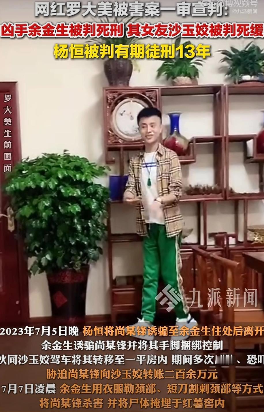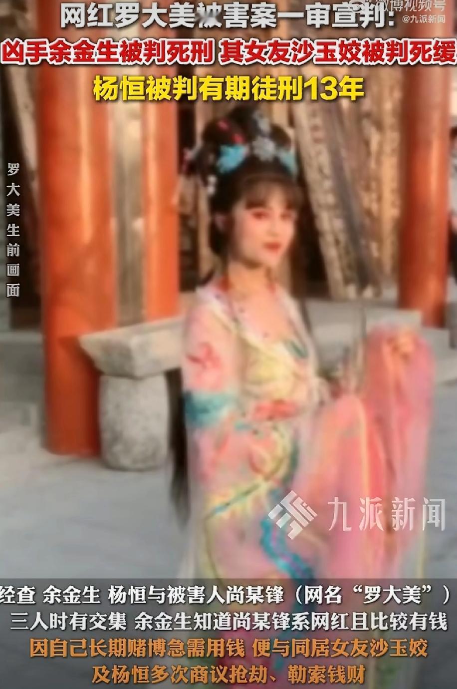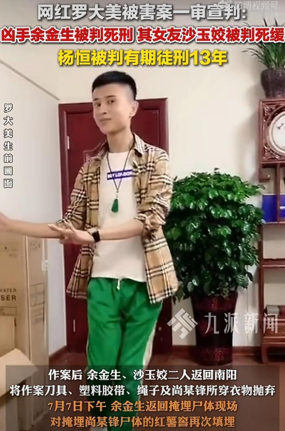 “罗大美案”今天落槌,南阳中院一句话:主犯余金生,死刑!立刻冲上热搜。 简单说,就是这位百万粉丝的“反串一哥”被熟人盯上,先被抢200多万,后遭勒颈割喉,尸体塞进红薯窖。手段之狠,连法官都用“特别残忍”来形容。 法庭把账算得明明白白: 1. 余金生——抢完再杀人灭口,主犯+故意杀人,两罪并罚,直接死刑。 2. 同居女友沙玉姣——全程看守、提供账户、事后还毁灭证据,死缓,两年后再看表现。 3. 把罗大美骗出门的杨恒——只参与前期诱骗,没动手也没分钱,从犯,判13年。 三个人还得把216万赃款和金银手表统统退回去,一分不能少。 听到结果,罗大美妈妈当庭落泪:“儿子,你可以闭眼了。”可妹妹还是哽咽:“沙玉姣没判立即执行,心里这关过不去。” 所以别再说“网红有钱就该低调”,再有钱也挡不住赌徒眼红。余金生是把熟人当提款机,把善良当软肋。法律这次没手软,也给所有想“杀熟”的人提个醒:动手那一刻,死刑就在终点等你。 (来源:九派新闻)
