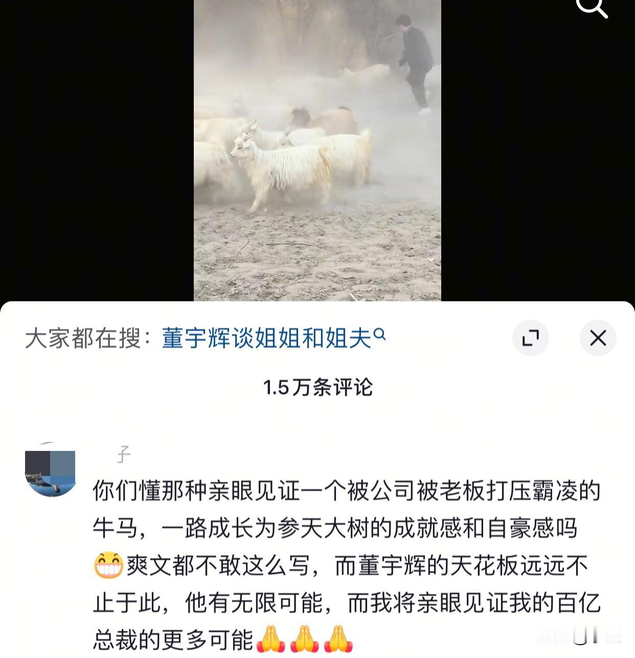 今天在董宇辉评论区看到一段话说的特别好,她说亲眼见证一个被公司打压的牛马,一路成长为参天大树的那种自豪感和成就感,连爽文都写不出来。 确实,我们今天看到宇辉开心的在新疆的胡杨林里追逐羊群,有摄像机对着他,有关心他的人围着他,评论区里1.5万条留言互动,那么多爱他的人在关注着他,因为大家知道从牛马到霸道总裁,他有多不容易,有一步行差踏错,他就可能跟其他爆火的网红一样,消失在公众视野里了。 偏偏董宇辉完成了身份的蜕变,实现了阶层的跨越,获得了几千万人的爱护,这何尝不是作为牛马的大家,内心的一种投射呢? 我们希望他一路平平安安,高歌猛进,就如同对自己的祝福一般。