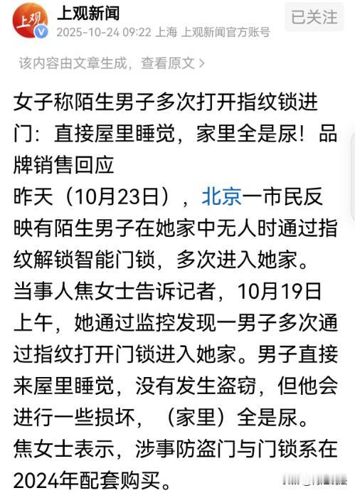 北京,焦女士家安了新防盗门和指纹锁,却多次发现家里有陌生人闯入痕迹,虽没丢东西,但被弄得脏乱不堪。她装监控后,看到陌生男子用指纹开锁,在床上睡觉还随地小便。焦女士质疑指纹锁质量,品牌方称是指纹相似导致,要返厂检测。 信源:上观新闻、闪电新闻 2024年,焦女士给自家换上了崭新的防盗门和指纹锁,可谁能想到,这看似坚固的防护,却不尽人意。 起初,焦女士只是偶尔察觉家里有些异样,东西摆放的位置变了,一些小物件被随意丢弃,可仔细清点后,贵重物品却一件不少。 这种变化,让焦女士心里直犯嘀咕,觉得家里似乎有陌生人来过。这种异样的感觉,越来越愈发强烈。 有一次,焦女士下班回家,刚打开门,一股刺鼻的气味扑面而来。她皱着眉头走进房间,发现床上凌乱不堪,被子被揉成一团,地上到处是污秽之物,整个房间,弥漫着一股难闻的尿骚味。 这人既不偷东西,却把家里弄得如此脏乱,到底有什么企图? 她越想越怕,万一哪天回家和这个神秘人撞个正着,后果不堪设想。 为了揭开这个谜,找到这个人,焦女士决定在家中安装监控。 10月19日,焦女士出门上班后,心里一直不踏实,总觉得有什么不好的事情要发生。 于是,她趁着工作间隙,打开了手机上的监控画面,当画面出现在屏幕上的那一刻,她吓得冷汗直冒。 只见一个陌生男子,堂而皇之地用指纹打开了门锁,走进了房间。他径直走向卧室,一头倒在焦女士的床上,呼呼大睡起来。 睡醒后,他还不讲究,在屋里随便小便,焦女士意识到,问题可能出在指纹锁上。 她联系了指纹锁的品牌方,质疑锁的质量存在问题。 品牌方,却给出了一个让人哭笑不得的解释,说可能是焦女士和陌生男子的指纹相似,导致锁出现了认假的情况,不过这种情况概率很低,他们要把锁寄回工厂进行检测。 焦女士无奈之下,只能等待检测结果。 陌生男子,非法侵入焦女士住宅,该行为违反《刑法》第二百四十五,非法侵入他人住宅的,处三年以下有期徒刑或者拘役。 该男子未经允许,使用指纹开锁进入焦女士家中,还在屋内睡觉、随地小便,严重侵犯了焦女士的住宅安宁权。 其动机虽未明确涉及盗窃等财物目的,但非法侵入住宅行为本身已构成犯罪。 住宅是公民的私密空间,受法律严格保护,任何未经许可的侵入行为都破坏了公民的生活安宁与隐私,该男子的行为,将会被判处三年以下的有期徒刑。 品牌方生产的指纹锁,出现认假情况,导致焦女士住宅被非法侵入,违反了《产品质量法》第四十一条:因产品存在缺陷造成人身、缺陷产品以外的其他财产(以下简称他人财产)损害的,生产者应当承担赔偿责任。 指纹锁技术缺陷使得本应保障安全的锁具失效,给焦女士带来精神恐惧等损害。 品牌方称指纹相似致认假概率低,但产品存在缺陷是不争事实,将锁寄回检测,只是后续补救措施,不能免除因产品缺陷给焦女士造成损失的赔偿责任。所以,品牌方,需要对对焦女士进行赔偿责任。