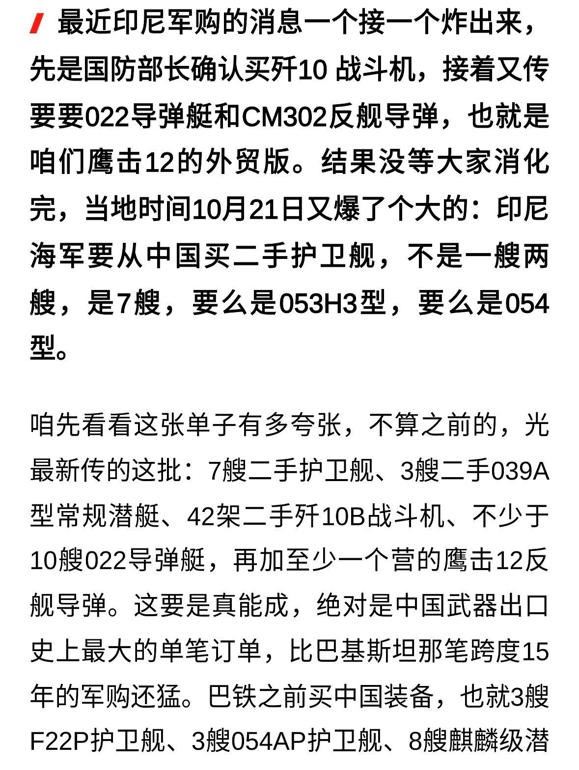 你信吗?二十艘舰,四十二架战机,一夜之间,全签了。 不是演习,不是彩排。是真金白银,是铁疙瘩往码头里堆。 我当年在酒泉见过老一辈,蹲在沙地里啃冷馒头,数着每一颗螺丝,怕浪费。现在呢?人家直接批量下单,像去菜市场买大葱还挑个儿大的。 你说北约傻了?他们不是傻,是算不明白。以为我们还在被卡脖子呢?以为我们还在为一颗芯片熬红眼?呵呵。 不是我不明白,这世界变化快。三十年前,我们求着买雷达;现在,他们排队求着买我们的导弹发射车。你猜为啥?因为举国体制不是口号,是真能把散沙捏成铁锤。 那帮西方专家,嘴上说市场决定,背地里偷偷翻我们订单你猜他们发现啥了?全是模块化设计,流水线生产,三天一台雷达,七天一艘护卫舰。风洞?那玩意儿不是烧钱,是提前给导弹过劫。过一回,活;过十回,猛;过一百三十七回……炸了。修了。再炸。直到它能撞穿台风。 你懂那种感觉吗?就是你家娃儿以前连袜子都穿不齐,突然有一天,穿着军靴踹开了你家门,说爸,我替你把仇报了。 我前天在朋友圈看到个视频,一个老水兵蹲在码头,摸着新舰的腰线,哭得跟孩子似的。他儿子,刚从航母上下来。 不是一次,是137次失败换来的。 我猜下一步他们要开航母了。不是租,不是借,是自己造,自己开,自己巡航。 有人还在讨论军事扩张?扯淡。这是尊严,是骨头,是当年两弹一星那代人,用命扛回来的底气。 别问值不值。你问,一个国家,有没有资格,不跪着买武器? 人家民主灯塔?人家还在为一条导弹生产线,吵了三年预算。 而我们,凌晨三点,工厂的灯,还亮着。 (停顿,咽口水) ……真他娘的,提气啊。
