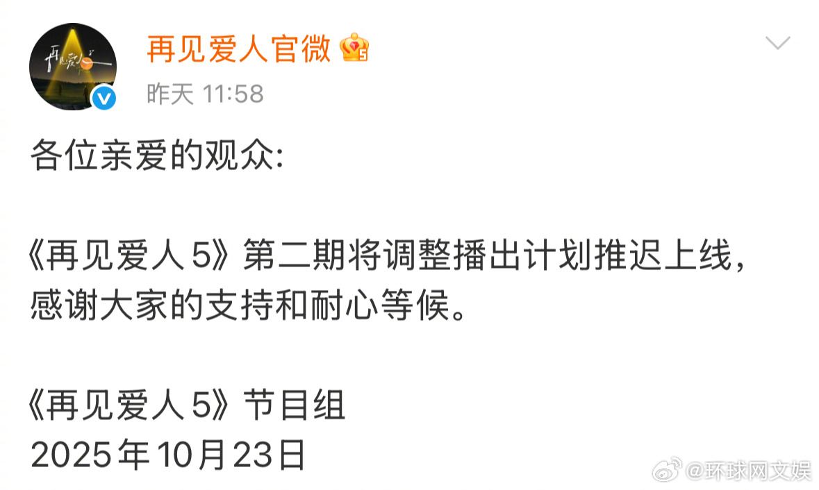 昨日,《再见爱人5》节目组宣布第二期将调整播出计划推迟上线。但24日中午,节目第二期已正式上线。