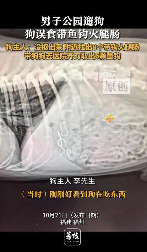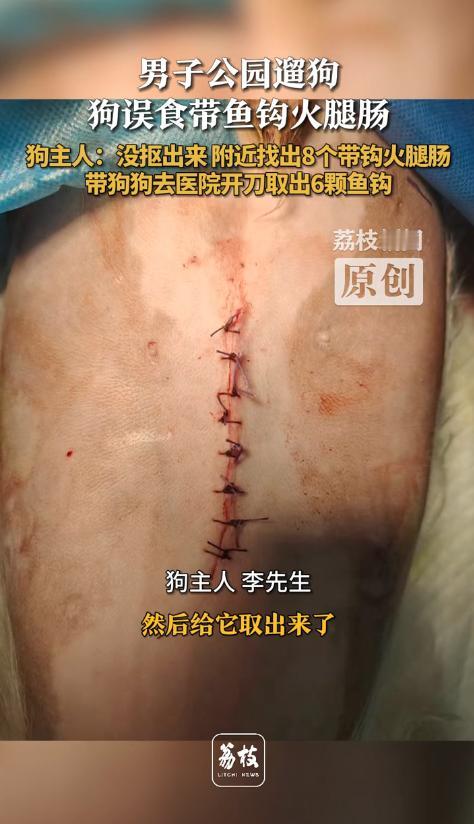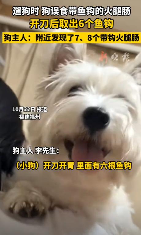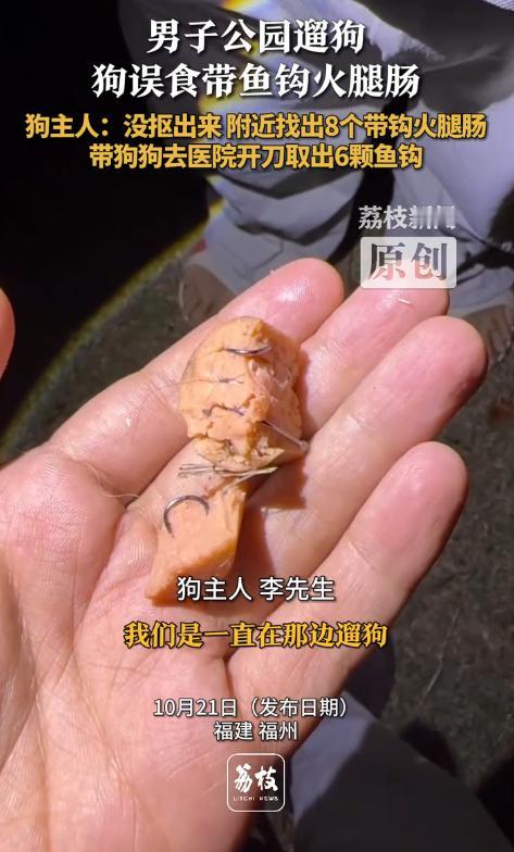 幸亏发现的及时,晚点的狗狗就没命了!10月20日,福建福州,一男子去公园遛狗时,发现狗狗在吃什么东西,他立即过去抠狗嘴,结果还是晚了一步,男子四处看了下,发现一旁有截火腿肠,他正打算扔掉,却感觉被什么东西扎了下,仔细一看,火腿肠中竟然藏着鱼钩,于是他立即带狗去医院做手术! 10月20日晚上,市民李先生像往常一样带着爱犬到公园散步,狗狗正跑得欢快,突然在草丛边停下,低头啃咬着什么,养过狗的人都知道,狗在外面乱吃东西很危险,李先生赶紧冲过去想掏出狗嘴里的东西,可惜晚了一步,狗狗已经吞了下去。 李先生环顾四周,发现草地上有半截火腿肠,他以为狗狗吃的就是这个,准备捡起来扔掉,免得其他狗误食,谁知手指刚碰到火腿肠,一阵刺痛传来,他忍痛掰开火腿肠,眼前的景象让他倒吸一口凉气,里面密密麻麻塞满了锋利的鱼钩! 意识到事态严重李先生赶紧在附近仔细搜寻,竟然又发现了多根藏有鱼钩的火腿肠,散落在公园各处,想到爱犬肚子里可能已经有这种致命的东西,他二话不说抱起狗狗直奔最近的宠物医院。 医院的X光片显示,狗狗胃里有整整6枚鱼钩,这些鱼钩随时可能刺穿内脏造成大出血,医生立即安排紧急手术,经过几小时的努力,终于将所有鱼钩取出狗狗转危为安。 事后李先生非常气愤于是将此事发布到了网上,事件曝光后网友们纷纷怒批投放火腿肠的人良心太坏了。 有网友直言这已经不是缺德,而是变态行为,在火腿肠里藏鱼钩,这种手段极其阴险毒辣,投毒者显然经过精心策划,利用狗狗爱吃火腿肠的习性设置陷阱,让伤害变得隐蔽而致命。 更让人担忧的是,这种行为不仅威胁动物生命,还危及公共安全,公园是老人孩子休闲的场所,万一小朋友捡到这种加料火腿肠,后果不堪设想。 城市养狗确实存在一些问题,比如不牵绳、随地大小便等不文明行为会给他人带来困扰,但解决矛盾的方式有很多,可以沟通协商,可以向相关部门反映,绝不能用如此极端残忍的手段报复。 况且李先生全程牵着狗绳,尽到了文明养犬的责任,他的狗狗并未招惹任何人,却成了无辜的受害者,这说明投毒者根本不区分狗主人行为好坏,而是无差别攻击所有狗,这种仇恨心理令人不寒而栗。 据了解,类似的投毒事件在全国各地时有发生,有的在狗粮里掺毒药,有的在肉块里藏刀片,手段五花八门,都是冲着要狗命去的,这些投毒者往往选择监控死角作案,给警方破案带来困难。 这件事也给所有宠物主人敲响警钟,出门遛狗时一定要看紧自己的宠物,最好给它们戴上嘴套,防止误食有毒食物,同时要提高警惕发现可疑食物立即清理并报警。 生命都是平等的,无论是人还是动物都应该得到尊重,用暴力对抗不文明本身就是更大的野蛮,希望这样的悲剧不再发生,让我们的城市多一些包容少一些戾气。 麻烦看官老爷们右上角点击一下“关注”,既方便您进行讨论和分享,又能给您带来不一样的参与感,感谢您的支持! 信息来源:《男子公园遛狗狗误食带鱼钩火腿肠狗主人:没抠出来 附近找出8个带钩火腿肠带狗狗去医院开刀取出6颗鱼钩》荔枝新闻