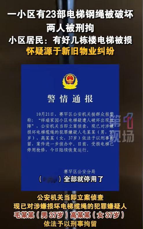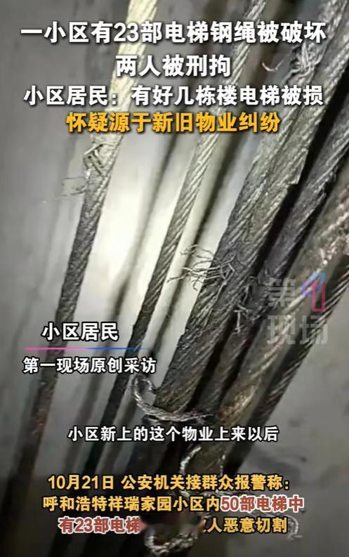 “简直坏到骨子里!”近日报道,内蒙古呼和浩特,电梯检修人员按惯例对小区电梯进行全面排查,结果发现50部电梯中,竟然有23部电梯的关键承重钢绳全被人故意割断!居民们又慌又气,报警后,帽子叔叔很快抓住犯罪人员。   “钢丝绳全被割了,这是要人命啊!”物业经理回忆起维修人员向他汇报时的场景,仍然心有余悸。   他们最初以为只是普通的电梯故障,直到打开顶部的机房,手电筒的光照向那些粗壮的钢丝绳时,所有人都倒吸一口冷气。   “你看这里,”王师傅(化名)指着其中一根钢丝绳,声音都在发抖,“切口这么整齐,明显是被人用工具割过的。还有这里,这根已经断了一半,再运转几次肯定要出大事。”   随后的排查结果更是让整个物业中心都不寒而栗,全小区50部电梯中,竟然有23部的关键承重钢绳遭到人为切割。有的被割的比较深;有的在不同位置被割了多个缺口,一旦受力就会彻底崩断。要是晚发现一天,赶上早高峰满载乘客的时候断了......   根据电梯领域业内人士的分析,普通人通常接触不到电梯的承重钢缆,因为需要专门的三角钥匙才能打开相关位置。因此,破坏者可能对电梯结构有一定了解。   据小区住户反映,此事可能与小区近期更换物业公司存在的矛盾有关。有住户指出,前物业公司曾因业主大会选聘新物业而表达不满,而电梯被破坏的时间点与前物业发布公开信的时间较为接近。但这一说法尚未得到警方证实,动机需以官方最终调查为准。   好在,报案两天后,警方就把嫌疑人毛某某和高某某刑事拘留了,至于这一男一女究竟是为什么要这么做,目前还在调查当中。而被损坏的电梯,经过抢修,目前也在陆续恢复使用。   这事儿一出,整个小区都炸开了锅。一位大爷气得直跺脚:“我老伴腿脚不好,每天就靠这电梯上下楼。这要是真出了事,我们这些老骨头可咋办?”他边说边摇头,“这些人啊,为了点利益连良心都不要了!”   住在高层的年轻妈妈事后想起来都还是一阵后怕:“现在想想都后背发凉,报警前一天我还抱着孩子坐了好几趟电梯呢!”   虽然嫌疑人已经落网,但这件事给小区带来的阴影一时半会儿还散不去。每天晚上,还有居民下意识地选择爬楼梯:“还是再等两天吧,等全部检测完了再坐电梯踏实。”   只能说,再结实的钢丝绳,也拴不住“坏了”的人心。但无论再大的矛盾,都不该拿无辜居民的性命来报复,这是做人的底线。 信源: 华商报——小区23部电梯钢绳遭恶意切割 光明网——小区23部电梯钢绳被破坏!警方通报   文│一阳 编辑│史叔