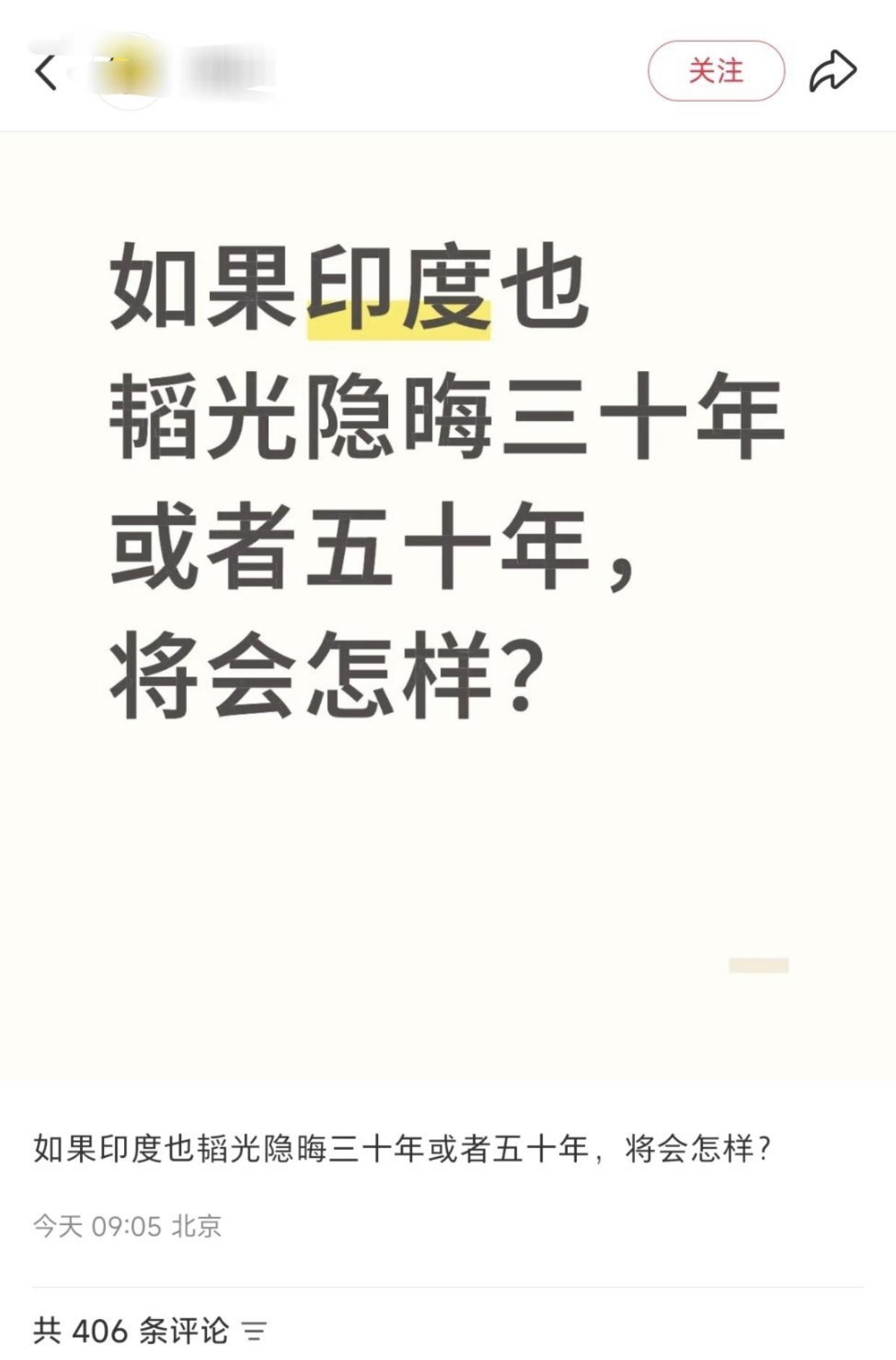 有一位网友发文问道: “如果印度也像中国一样韬光养晦30年,或者50年,将会变得怎么样? 是取得和中国一样的发展成就, 甚至超越?!”