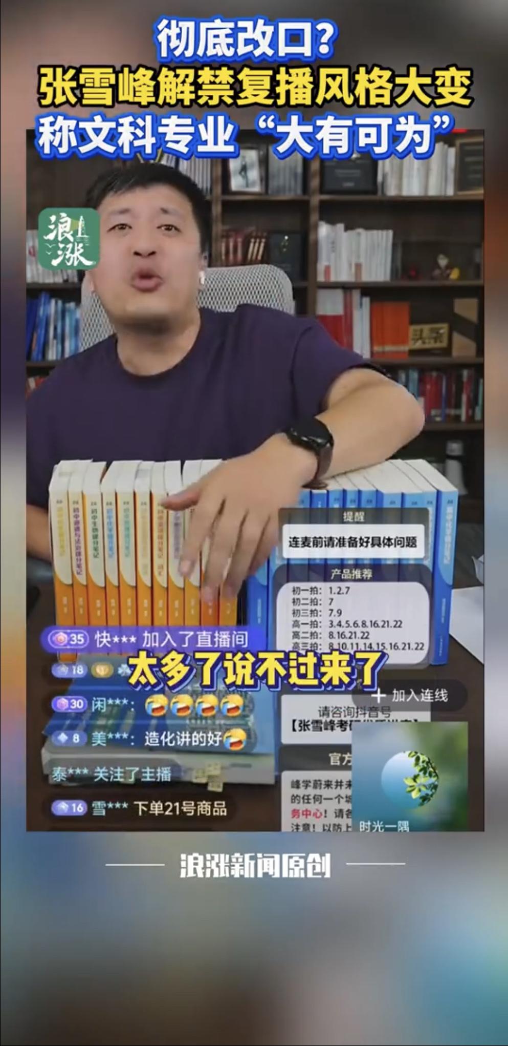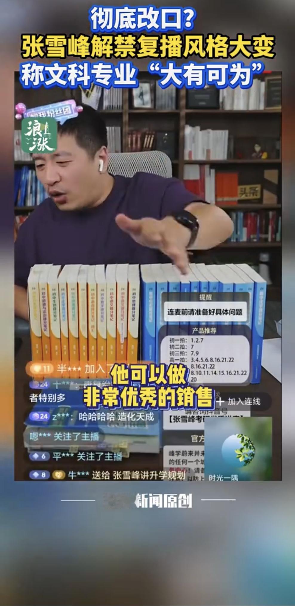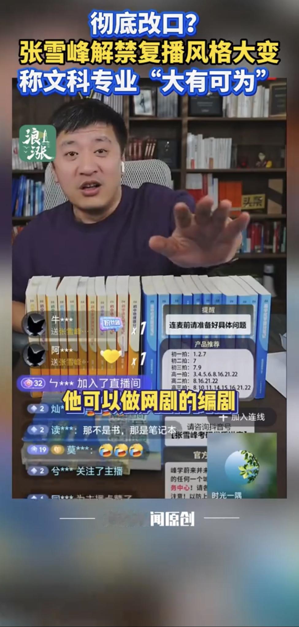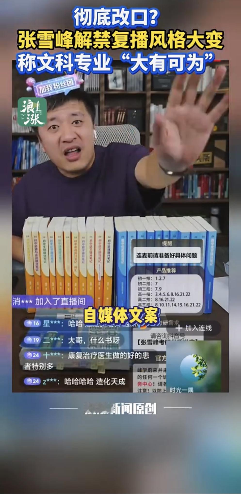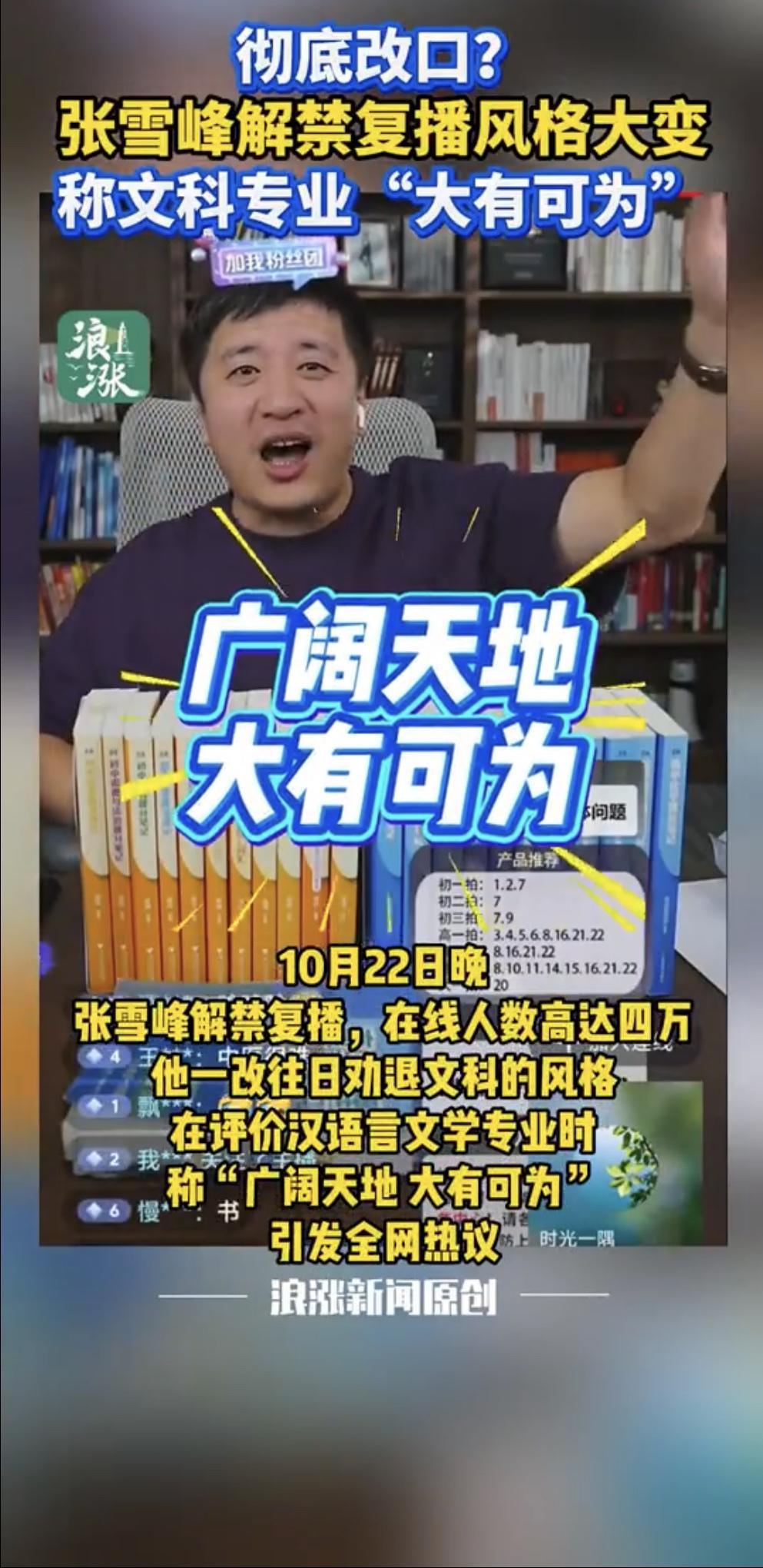 张雪峰解禁后改口称: “广阔天地,文科专业,大有可为, 文科生可以做网剧的编剧,自媒体文案,甚至可以做非常优秀的销售,太多了,说不过来了。”