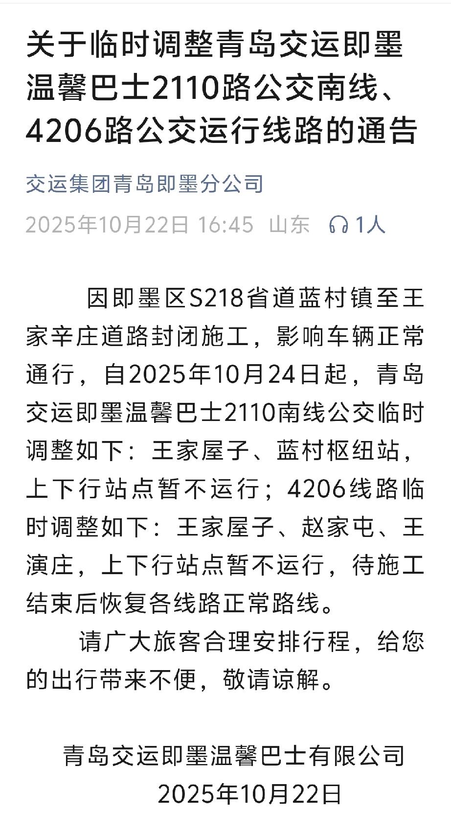 即墨交运温馨巴士公司前天发布的2110路公交南线、4206路公交运行线路临时调整