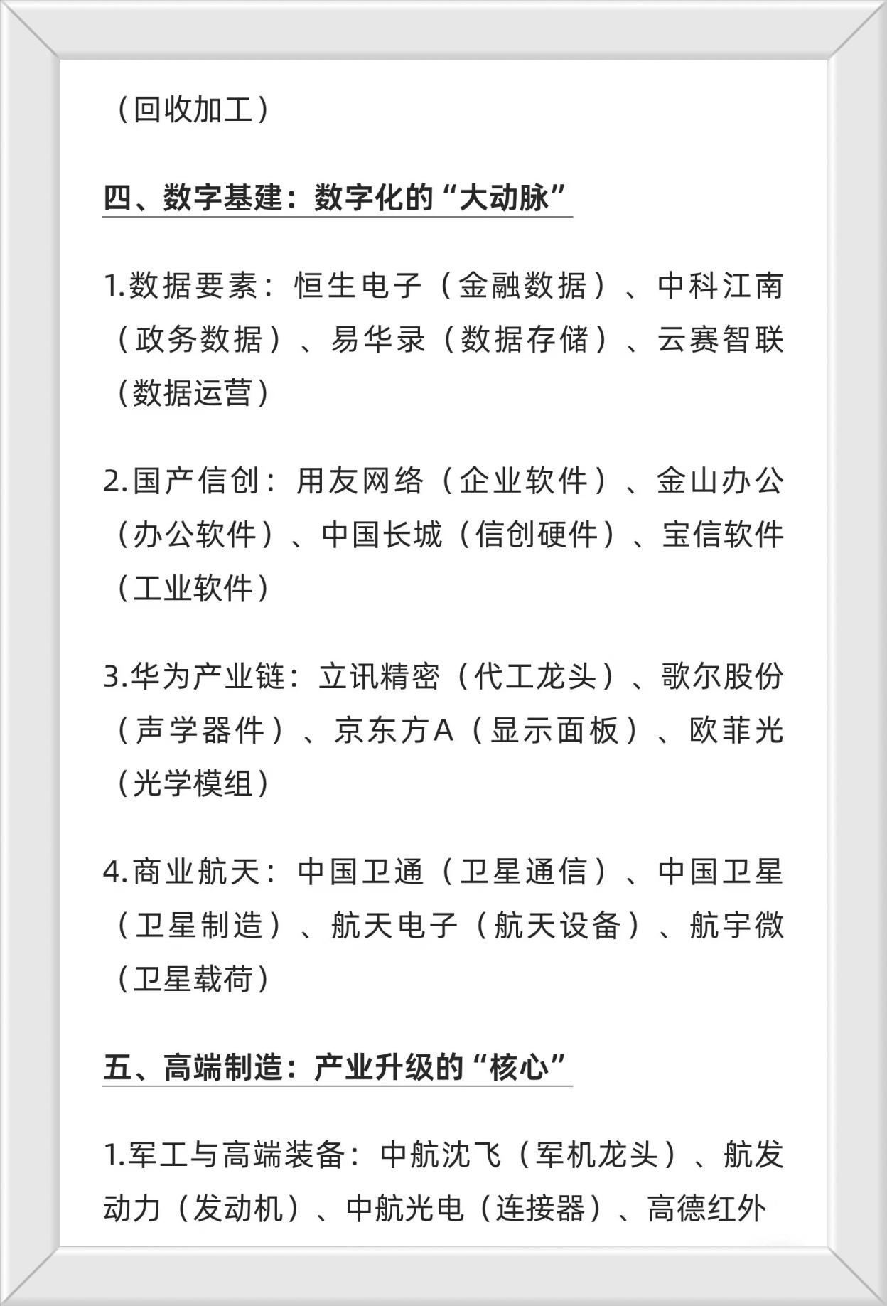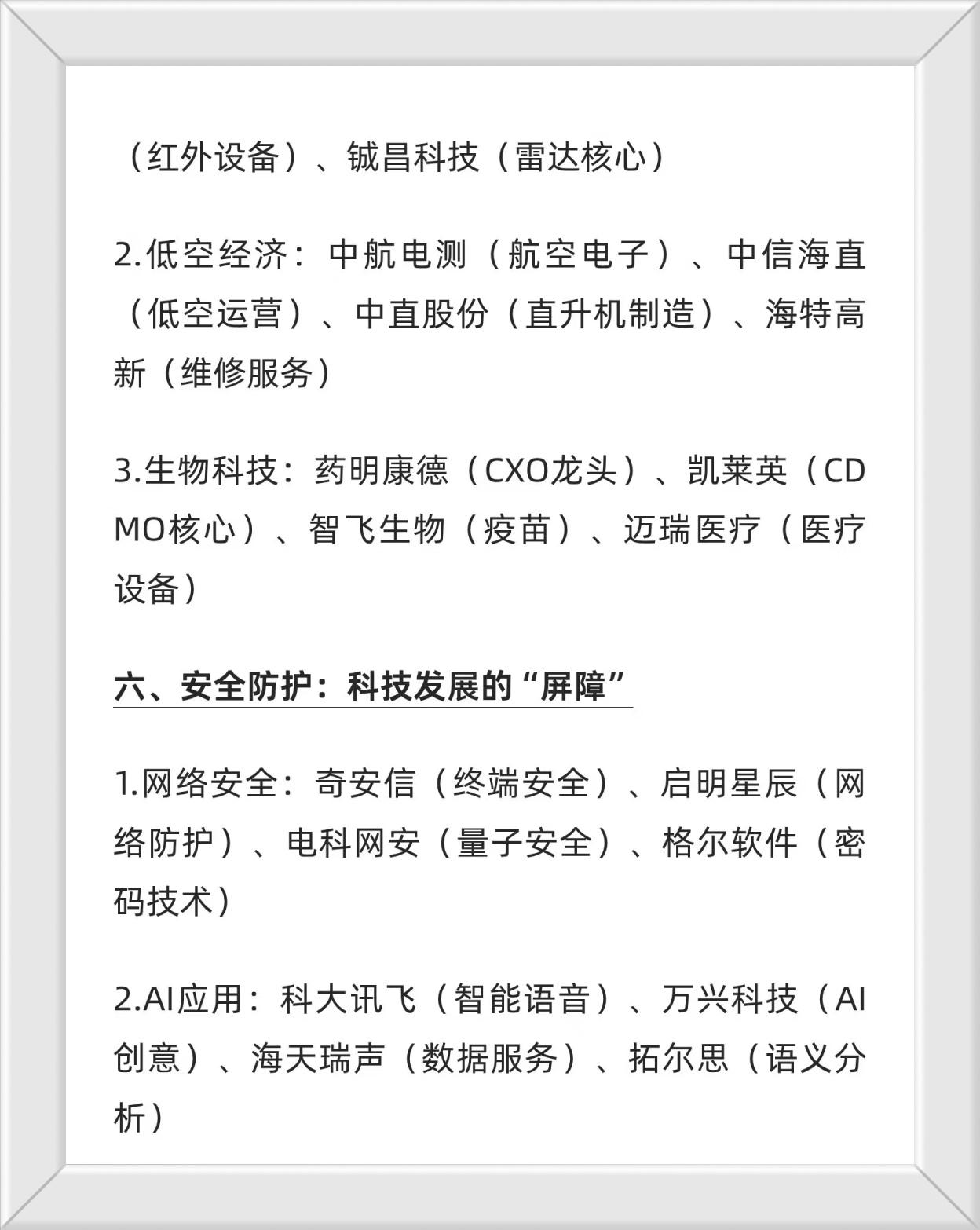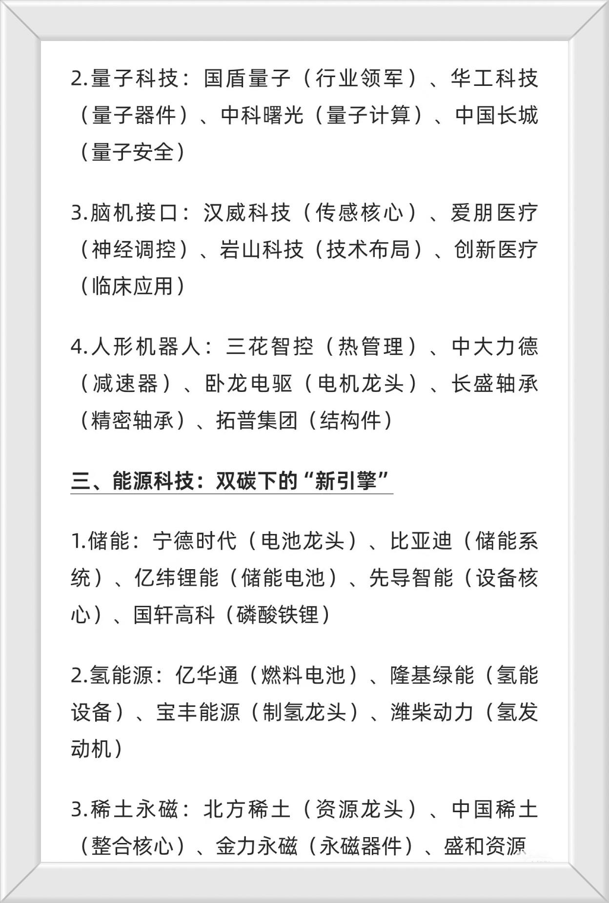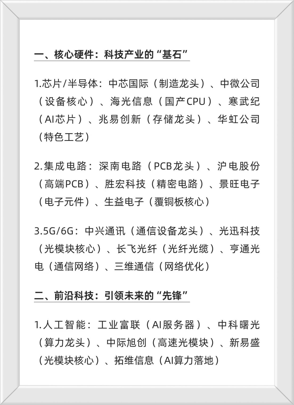 科技产业领域核心概念股。以下从多个关键领域介绍了相关核心技术、前沿方向、基础设施、高端制造以及安全防护板块 一、核心硬件:科技产业的“基石” 这是科技产业的基础部分,主要包括: - 芯片/半导体:如中芯国际(制造龙头)、中微公司(设备核心)、海光信息(国产CPU)、寒武纪(AI芯片)、兆易创新(存储龙头)、华虹公司(特色工艺)等,覆盖芯片制造、设备、CPU、AI芯片、存储及特色工艺等关键环节。 - 集成电路:包括深南电路(PCB龙头)、沪电股份(高端PCB)、胜宏科技(精密电路)、景旺电子(电子元件)、生益电子(覆铜板核心),聚焦印刷电路板及电子元件等基础组件。 - 5G/6G:有中兴通讯(通信设备龙头)、光迅科技(光模块核心)、长飞光纤(光纤光缆)、亨通光电(通信网络)、三维通信(网络优化),涉及通信设备、光模块、光纤光缆及网络优化等领域。 二、前沿科技:引领未来的“先锋” 代表未来发展方向的技术和企业,主要包括: - 人工智能:工业富联(AI服务器)、中科曙光(算力龙头)、中际旭创(高速光模块)、新易盛(光模块核心)、拓维信息(AI算力落地),体现AI在服务器、算力、光模块及落地应用等方面的发展。 - 量子科技:国盾量子(行业领军)、华工科技(量子器件)、中科曙光(量子计算)、中国长城(量子安全),涵盖量子器件、计算及安全等方向。 - 脑机接口:汉威科技(传感核心)、爱朋医疗(神经调控)、岩山科技(技术布局)、创新医疗(临床应用),涉及传感、神经调控、技术布局与临床应用。 - 人形机器人:三花智控(热管理)、中大力德(减速器)、卧龙电驱(电机龙头)、长盛轴承(精密轴承)、拓普集团(结构件),聚焦机器人关键零部件。 三、能源科技:双碳下的“新引擎” 在双碳目标推动下,能源科技领域的重要企业和方向包括: - 储能:宁德时代(电池龙头)、比亚迪(储能系统)、亿纬锂能(储能电池)、先导智能(设备核心)、国轩高科(磷酸铁锂),覆盖电池、储能系统及设备等。 - 氢能源:亿华通(燃料电池)、隆基绿能(氢能设备)、宝丰能源(制氢龙头)、潍柴动力(氢发动机),涉及燃料电池、氢能设备及制氢、氢发动机等。 - 稀土永磁:北方稀土(资源龙头)、中国稀土(整合核心)、金力永磁(永磁器件)、盛和资源,围绕稀土资源、整合及永磁器件。 四、数字基建:数字化的“大动脉” 作为数字化发展的基础支撑,包含: - 数据要素:恒生电子(金融数据)、中科江南(政务数据)、易华录(数据存储)、云赛智联(数据运营),涉及金融、政务数据及数据存储、运营。 - 国产信创:用友网络(企业软件)、金山办公(办公软件)、中国长城(信创硬件)、宝信软件(工业软件),涵盖企业、办公、信创硬件及工业软件。 - 华为产业链:立讯精密(代工龙头)、歌尔股份(声学器件)、京东方A(显示面板)、欧菲光(光学模组),围绕华为相关的代工、声学、显示及光学领域。 - 商业航天:中国卫通(卫星通信)、中国卫星(卫星制造)、航天电子(航天设备)、航宇微(卫星载荷),涉及卫星通信、制造、设备及载荷。 此外,在高端制造板块中,重点提及了军工与高端装备,包括中航沈飞(军机龙头)、航发动力(发动机)、中航光电(连接器)、高德红外等,体现产业升级的核心力量;还有低空经济(如中航电测、中信海直等)、生物科技(如药明康德、凯莱英等)相关内容。 五、安全防护:科技发展的“屏障” 保障科技发展安全的关键领域,主要有: - 网络安全:奇安信(终端安全)、启明星辰(网络防护)、电科网安(量子安全)、格尔软件(密码技术),覆盖终端、网络、量子及密码安全。 - AI应用:科大讯飞(智能语音)、万兴科技(AI创意)、海天瑞声(数据服务)、拓尔思(语义分析),涉及智能语音、创意、数据服务及语义分析等AI应用方向。
