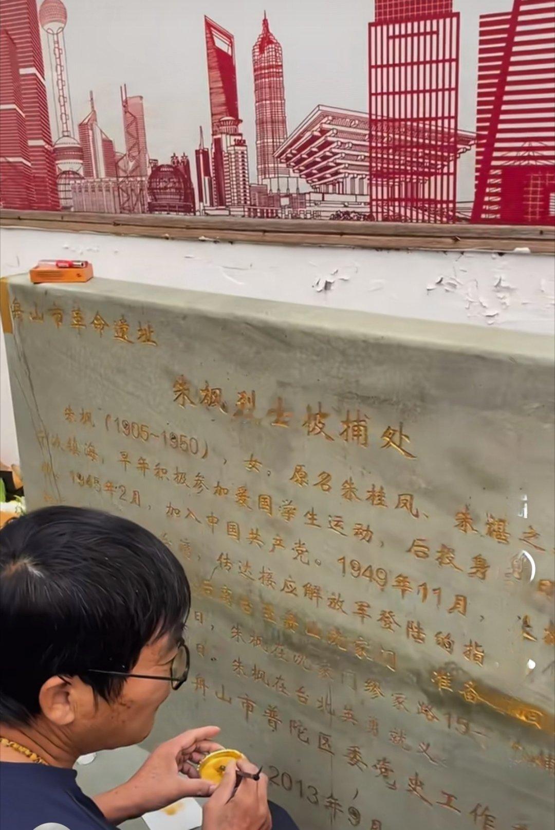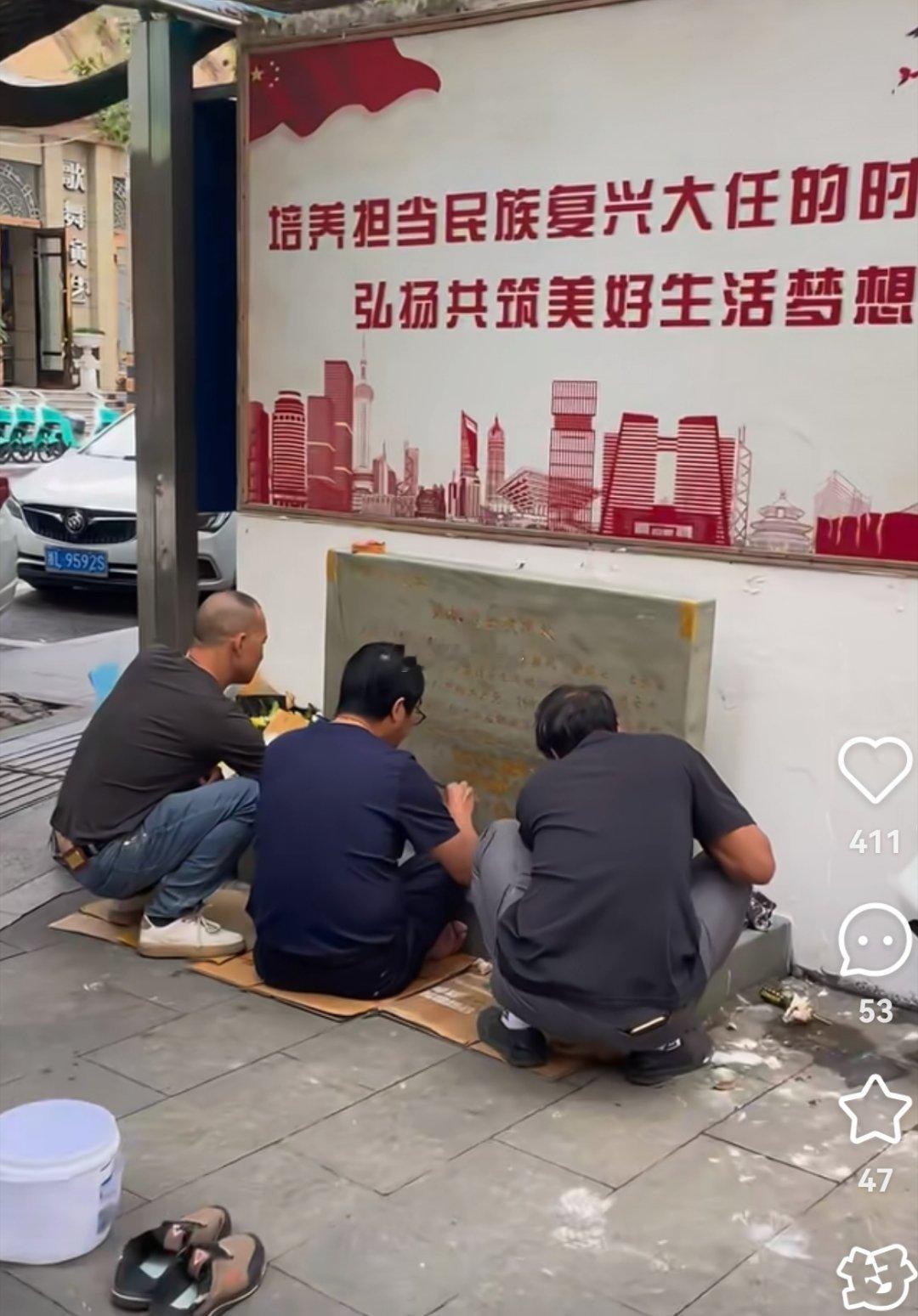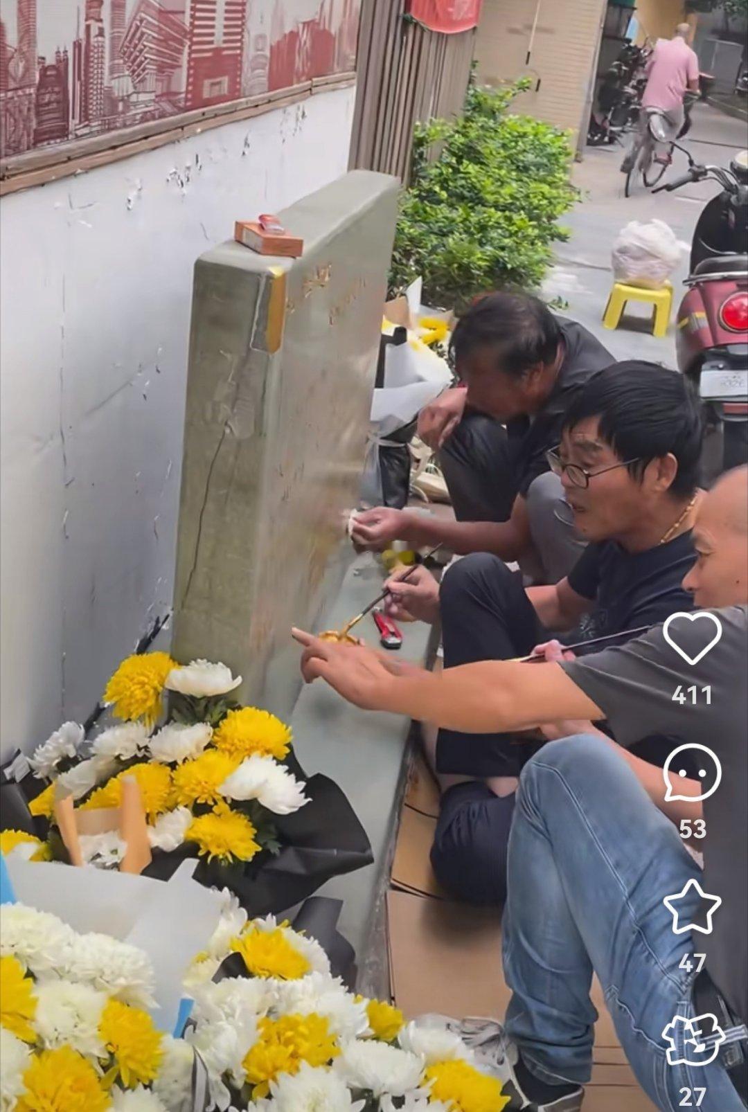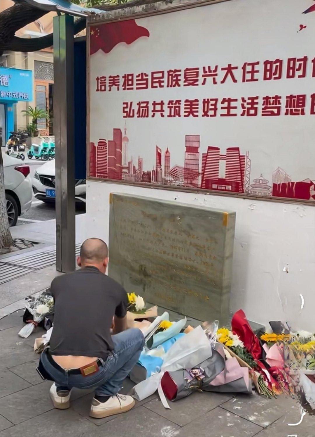 当地街道在修缮其纪念碑,碑前放满了市民自发献的鲜花。