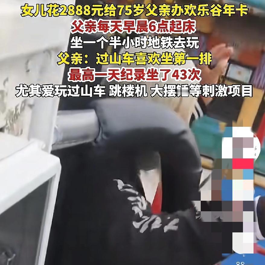 女儿花2888元 给75岁父亲办欢乐谷年卡 父亲每天早晨6点起床,坐一个半小时地铁去玩,北京卢大爷这波操作真的溜! 卢大爷一天刷43次过山车,落地还能小跑着排下一轮,反倒是同车的年轻人腿软扶墙。他还说下来之后步履轻盈,浑身舒坦,真的让我佩服。 我们印象中老人就是遛弯晒太阳,跳跳广场舞,原来他们也需要能点燃热情的乐趣。女儿这张年卡,比吃啥保健品都管用,真是送到心坎上了。 其实我觉得,年龄从来不是快乐的上限,不要让标签轻易定义了自己,我们活着就要有这种折腾的精神,这样才不枉来人世走一遭。欢乐谷体验卡 快乐