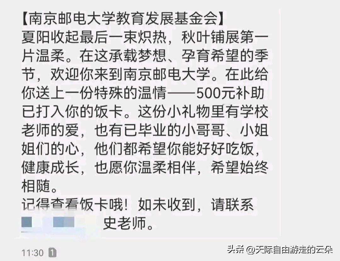 暖心!南邮悄悄往新生饭卡充500元,19批关怀温暖学子心 10月21日,南京邮电大学部分2025级新生收到一条特殊短信:“500元补助已打入你的饭卡。”没有预告、没有声张,这份“静悄悄”的温暖来自学校教育发展基金会的“柚子饭卡”公益项目。这是该项目第19次发放关怀,30名新生因此受益。 “怕你吃不好”,南邮的温柔藏进饭卡里 “柚子饭卡”始于2021年2月,旨在帮助经济困难学生改善饮食。基金会老师坦言:“学校担心有些同学为省钱吃得简单,长期影响健康,所以希望他们‘好好吃饭,吃好一点’。”与传统帮扶不同,这份补助直接打入饭卡,不公开、不标记,既保护隐私,又确保专款专用。从2022年起,项目每年至少发放4次,累计金额超24.25万元,惠及496名学生。 爱心背后的“隐形守护者” 每一笔补助背后,是无数捐赠者的善意接力。一位殷老师自2022年起每月捐赠1000元,累计3.8万元;校友吴先生一次性捐赠50万元并承诺持续支持;学生家长陈女士每年定期捐款……正是这些“隐形守护者”,让“柚子饭卡”得以持续传递温暖。 基金会还通过食堂消费数据分析、学生困难程度评估等方式精准筛选名单,确保每一分钱都用到实处。一位收到补助的新生感慨:“钱虽不多,但这份心意让我感受到南邮的关怀,未来也想把爱传递下去。” 江苏高校的“饭卡关怀”成风潮 南邮的暖心举措并非个例。近年来,江苏多所高校通过类似方式默默资助学生,如南京大学“隐形餐补”、东南大学“暖心饭卡”等,均以保护隐私为前提,将关怀融入日常。 网友互动 你经历过或听说过哪些暖心的校园关怀?欢迎留言分享!❤️ 参考资料 交汇点新闻《“好好吃饭!”这所高校悄悄将爱心注入同学饭卡》 现代快报《“500元补助已打入你的饭卡”,南京一高校悄悄给学生加餐补》 人民网江苏《江苏一高校,又悄悄往学生饭卡里充钱了》