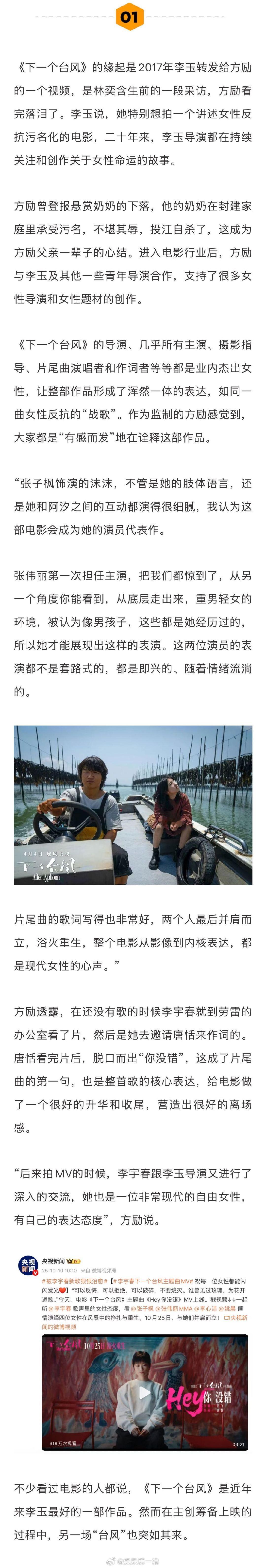 方励谈下一个台风不改档不撤档 方励谈下一个台风中的女性力量 最近数部文艺片撤档改档,《下一个台风》要面对的也是未知前景。主创们说,既然电影照进了现实,那就像片中的人物一样,一起去迎接这场“台风”。“大家都还是有点心气在的,既然电影里的两位女主角面对谣言的风浪敢于去回击,有这样一个劲头,如果现实里的我们怂了,会觉得对不住自己想表达的东西。”娱理独家↓