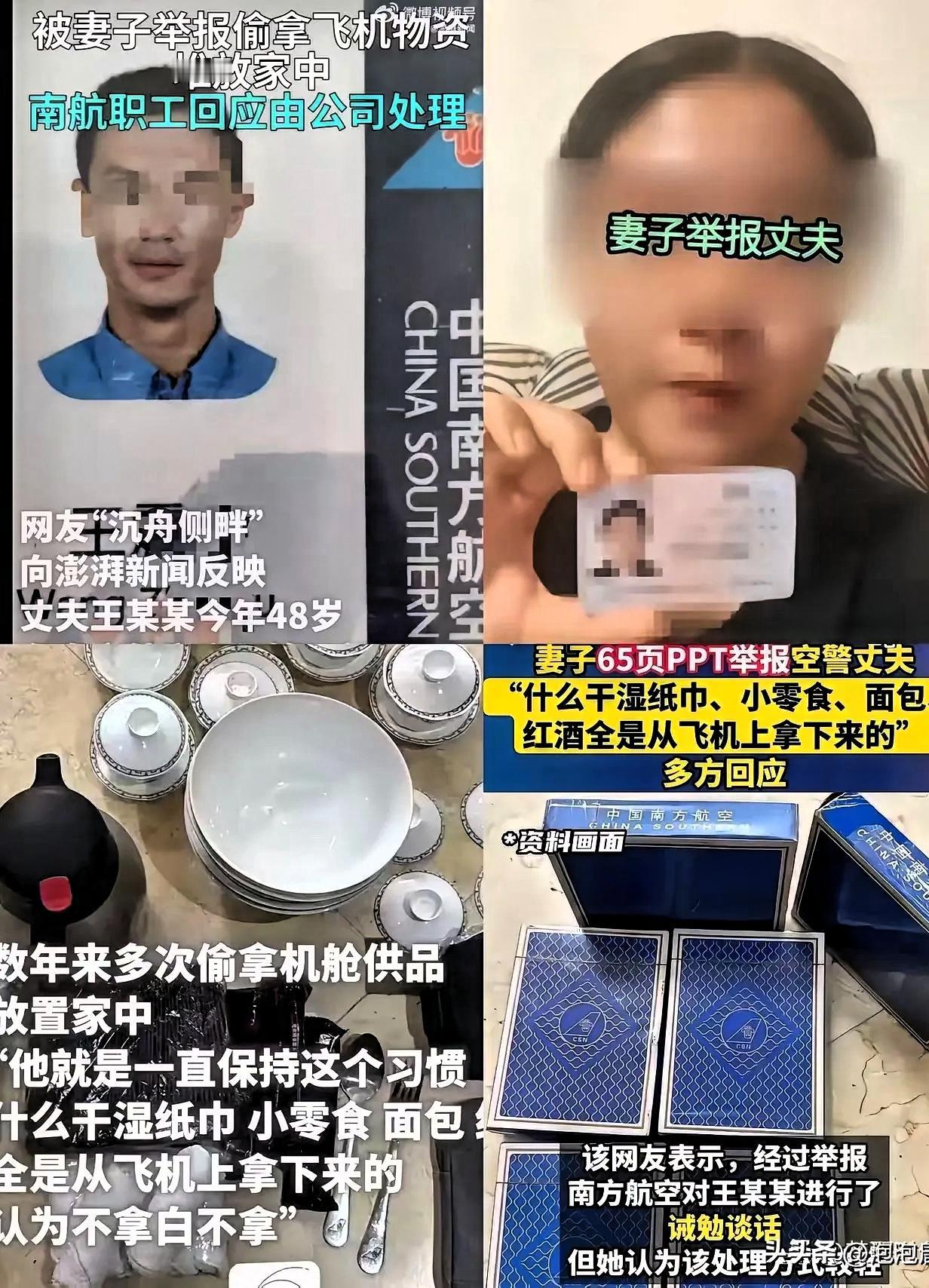 真应了那句话:想害你的人,往往就藏在枕边! 48岁南航空警这遭遇太寒心——妻子为离婚,硬是写了65页PPT举报他“侵吞公司财物”。可所谓“赃物”,不过是机上用剩的拖鞋、小面包、湿纸巾,明明是他揣着顾家心思随手带的,妻子享用着还转头下狠手。 我倒觉得,能惦记着把“用不上的小东西”带回家的男人,才是真的把家放在心上。不浪费、懂算计,这哪是贪小便宜,是过日子的实在劲儿。 反观这位妻子,为了离婚把小事往死里闹,耗的不是对方的名声,是两人曾经的情分。感情没了好聚好散不行吗?非要用这种狠招,实在让人看不起。 你们身边有这种“把家挂在细节里”的人吗?遇到这种撕破脸的离婚方式,你会觉得过分吗?