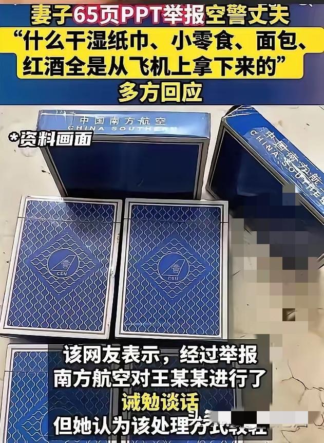 别再说这是空警妻子“狠心”! 南航空警被65页PPT举报的事, 真不是离婚闹剧。 说拿剩拖鞋、面包是“会过日子”?根本站不住脚! 他连红酒、南航标刀叉都往家搬,堆得像仓库, 可公司早规定剩余物资要回收或捐慈善, 这就是违规。 之前有空姐吃份剩餐都被停飞, 他这操作更离谱。 妻子攒两年证据举报, 或许有离婚原因, 但更多是对“原则失守”的较真。 结果就诫勉谈话?这不是纵容吗? 把违规当“顾家”, 把较真当“恶毒”, 才真糊涂。 你觉得这种“小便宜”该较真吗?空警600 辞职举报