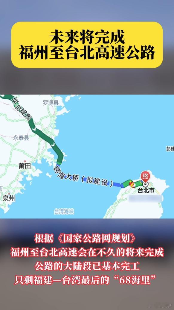 今年刚好是台湾光复80周年,京台高速的大陆段也都完工,就差福建到台湾的 68 海里,大概126公里的距离,等通车后开车一小时就能跨越海峡~