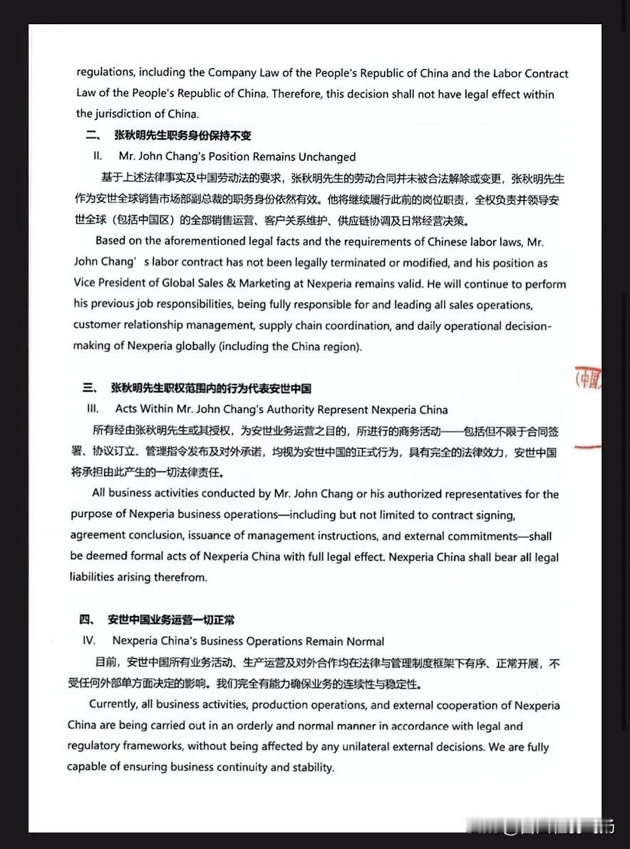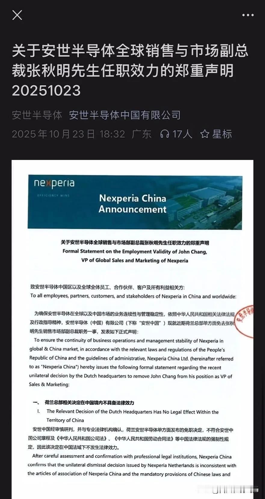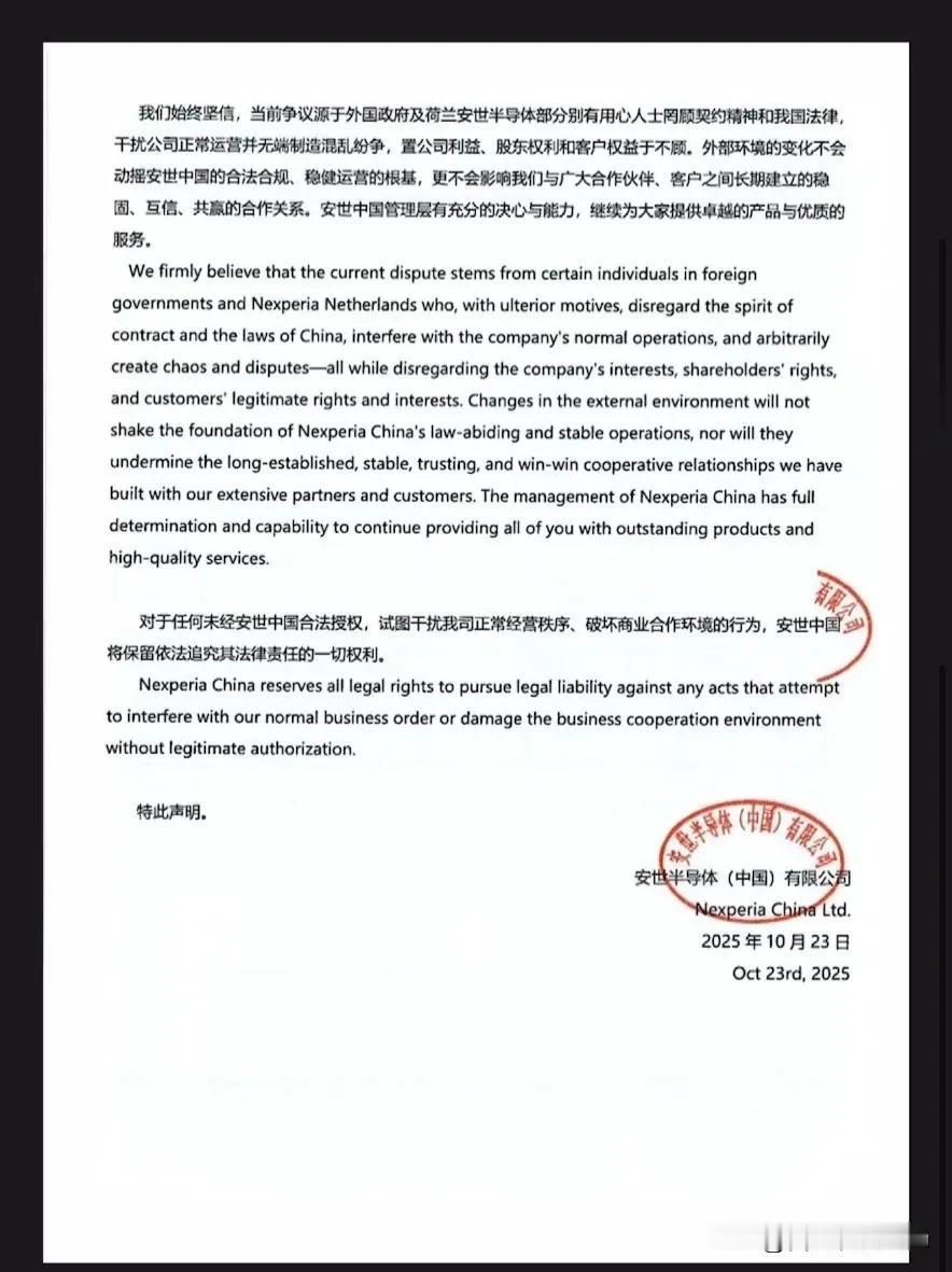 安世中国再次硬怼荷兰总部:没有法律效力! 10月23日,安世半导体中国通过官方渠道发布声明,直指荷兰总部单方面免去全球销售市场部副总裁张秋明职务的决定“不具备法律效力”,明确表示张秋明的身份职权不变,公司生产运营、客户供货一切如常。 这份声明字字铿锵,标志着中荷双方的博弈已走到彻底决裂的边缘。这场风波的源头,是荷兰方面一场堪称“闪电战”的夺权行动。9月30日,荷兰经济事务与气候政策部以“国家安全”为由下达部长令,冻结安世半导体价值147亿元的全球资产,暂停中方董事长兼CEO张学政的职务。 短短7天后,阿姆斯特丹上诉法院企业法庭便作出裁决:剥夺中方管理权,引入外部控制,指派外籍人士担任非执行董事。要知道,欧洲同类案件的审理周期平均长达三个月,如此仓促的裁决,很难不让人质疑其背后的政治操弄。 荷兰方面的算盘打得倒是精明:安世半导体总部在荷兰,只要控制了总部资产、换掉中方高管,中方公司这边自然会乖乖就范。这种想法简直是天真到了极点,他们显然没搞懂安世半导体的核心价值究竟在哪。 安世的命脉从不是荷兰那间空壳总部办公室,而是扎根中国的生产基地与技术团队,其下游封测等关键业务全在中国境内。更可笑的是,他们连最基本的风险预案都没做,既没提前为客户备下库存,也没搭建备用生产链条,仿佛夺权就能自动掌控一切。 中方的反击来得迅速且有力,这已是安世中国几天内第三次发布强硬声明,每一次都直击要害。最新声明中明确指出,荷兰总部的任免决定违反《公司法》《劳动合同法》等强制性规定,在中方法域下完全无效。 张秋明依然全权负责全球销售运营、供应链协调等核心工作,其授权的商务活动均代表安世中国,具备完全法律效力。商务部也早已亮明态度,10月4日便发布出口管制通知,禁止安世中国公司出口特定成品组件,10月21日商务部部长王文涛更是直接与荷兰经济大臣通话,敦促对方“秉持契约精神”妥善解决问题。 荷兰人没料到中方会如此强硬,更没料到自己的鲁莽举动会引发全球产业链的震荡。安世半导体生产的车规级半导体,近一半市场都来自欧洲汽车工厂,对全球车企而言堪称“不可或缺”。风波刚起,欧洲车企便率先慌了神,大众汽车已宣布将暂停部分生产,数万德国员工面临停工风险。 紧随其后,日本车企协会也急成了热锅上的蚂蚁,公开警告若供货中断,本国车企可能马上停产。美国有线电视新闻网(CNN)更是直言,安世的芯片找不到轻易替代的产品,供应危机正快速蔓延至美国汽车制造业。 原本以为能“轻松夺权”的荷兰方面,这下彻底傻眼了。失去中国工厂的配合,荷兰总部手里的“管理权”不过是张废纸,根本无法向全球客户兑现供货承诺。此前还态度强硬的荷兰总部,如今已主动拨通中方电话,试图寻求“双方都能接受的方案”。 这种前倨后恭的转变,恰恰暴露了其外强中干的本质——所谓的“行政接管”,不过是一场没摸清底牌的闹剧。更讽刺的是,荷兰总部为了给自己脸上贴金,竟向全球客户发出警告,声称“无法保证中国工厂的芯片质量”。 这种说辞简直站不住脚,安世中国早已公开表态,所有生产活动都在法律框架下有序开展,完全有能力保障业务连续性。客户们的眼睛是雪亮的,谁在制造混乱、谁在稳定供应,一目了然。荷兰方面这种置客户权益于不顾的做法,只会彻底透支安世半导体多年积累的品牌信誉。 这场博弈背后,折射出的是部分西方国家根深蒂固的傲慢。横行世界两三百年的历史,让他们习惯了用强权凌驾于规则之上,忘了什么叫尊重、什么叫平等。他们以为靠着“国家安全”的幌子,就能随意践踏契约精神,就能用政治手段掠夺商业成果。 可时代早就变了,如今的中方企业早已不是任人拿捏的软柿子,面对不合理的压迫,必然会用法律和规则捍卫自身权益。安世中国的抗争,给所有跨国企业和主权国家提了醒:全球产业链早已是你中有我的共同体,任何单边主义、霸权行径都只会反噬自身。 荷兰方面的夺权行动,不仅没能拿到实际控制权,反而搅乱了全球汽车芯片供应链,损害了包括荷兰企业在内的多方利益。这种“损人不利己”的操作,违背了市场化、法治化的基本准则,也让国际社会看清了其维护“霸权”而非“安全”的真实目的。 目前,荷兰经济大臣已表态“愿与中方密切沟通,寻找建设性解决方案”,这或许是局势转向的信号。但安世中国的态度已然明确:底线问题绝不让步,合法权益不容侵犯。这场风波终将落幕,但它留下的教训会被永远铭记:商业合作的根基是契约精神,国家交往的前提是相互尊重,任何试图用强权打破规则的行为,最终都只会自食恶果。 安世中国用行动证明,中国人的骨气从不是喊出来的,而是在每一次不公面前,都敢挺直腰杆说“不”。这股底气,来自对法律的信仰,来自对自身实力的自信,更来自对公平正义的坚定捍卫。